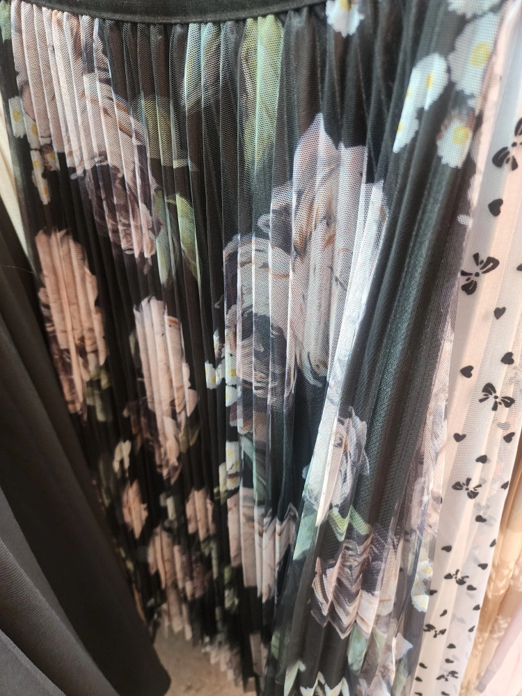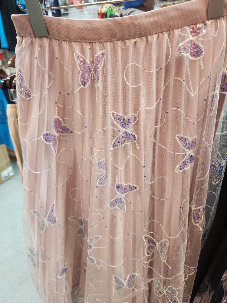 Set of five pleated midi skirts. Floral print, light gray, black hearts, pink butterflies, and pink polka dots. Various sizes available. Lightweight material.