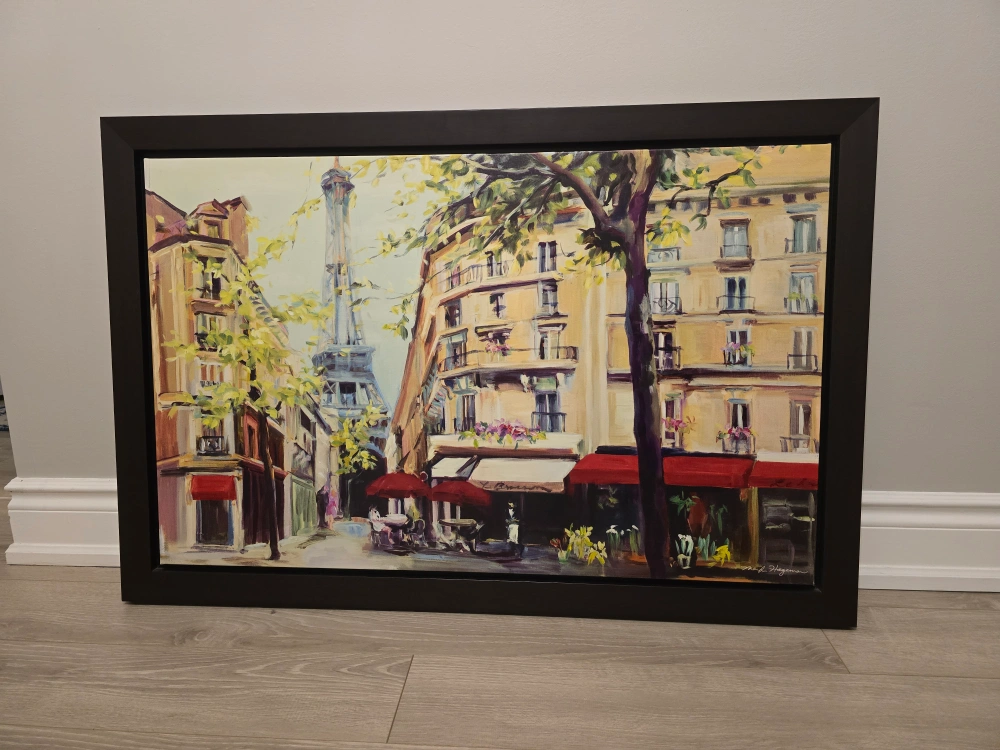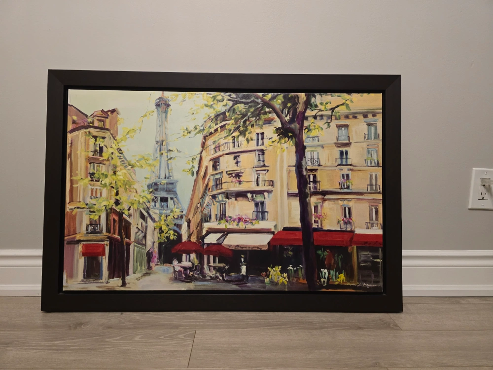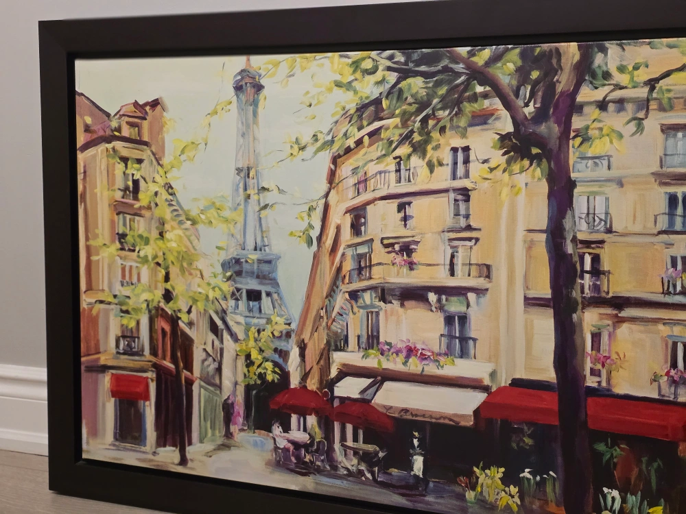 Beautiful framed canvas print. Depicts a Parisian street scene with the Eiffel Tower in the background. Vibrant colours and details. Ready to hang.