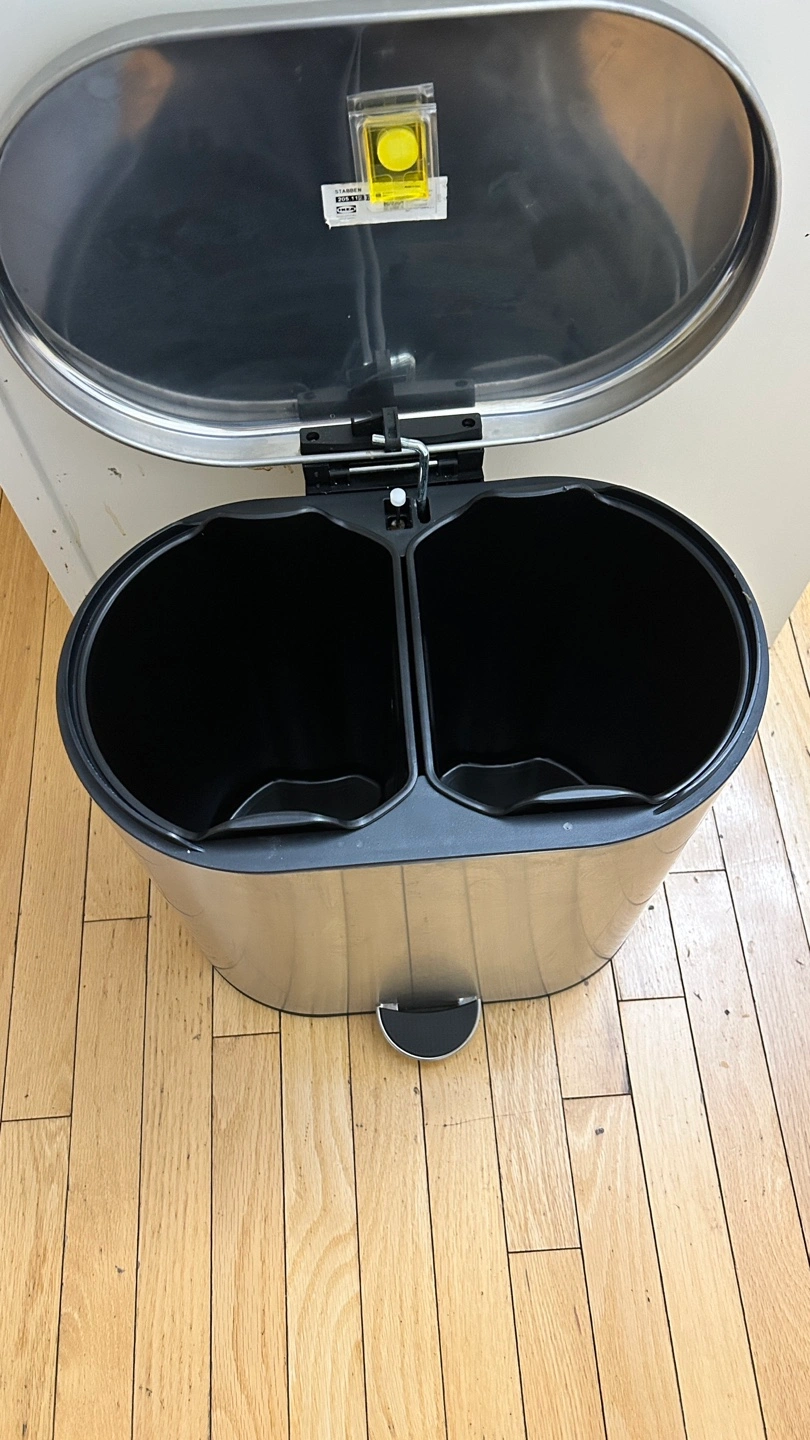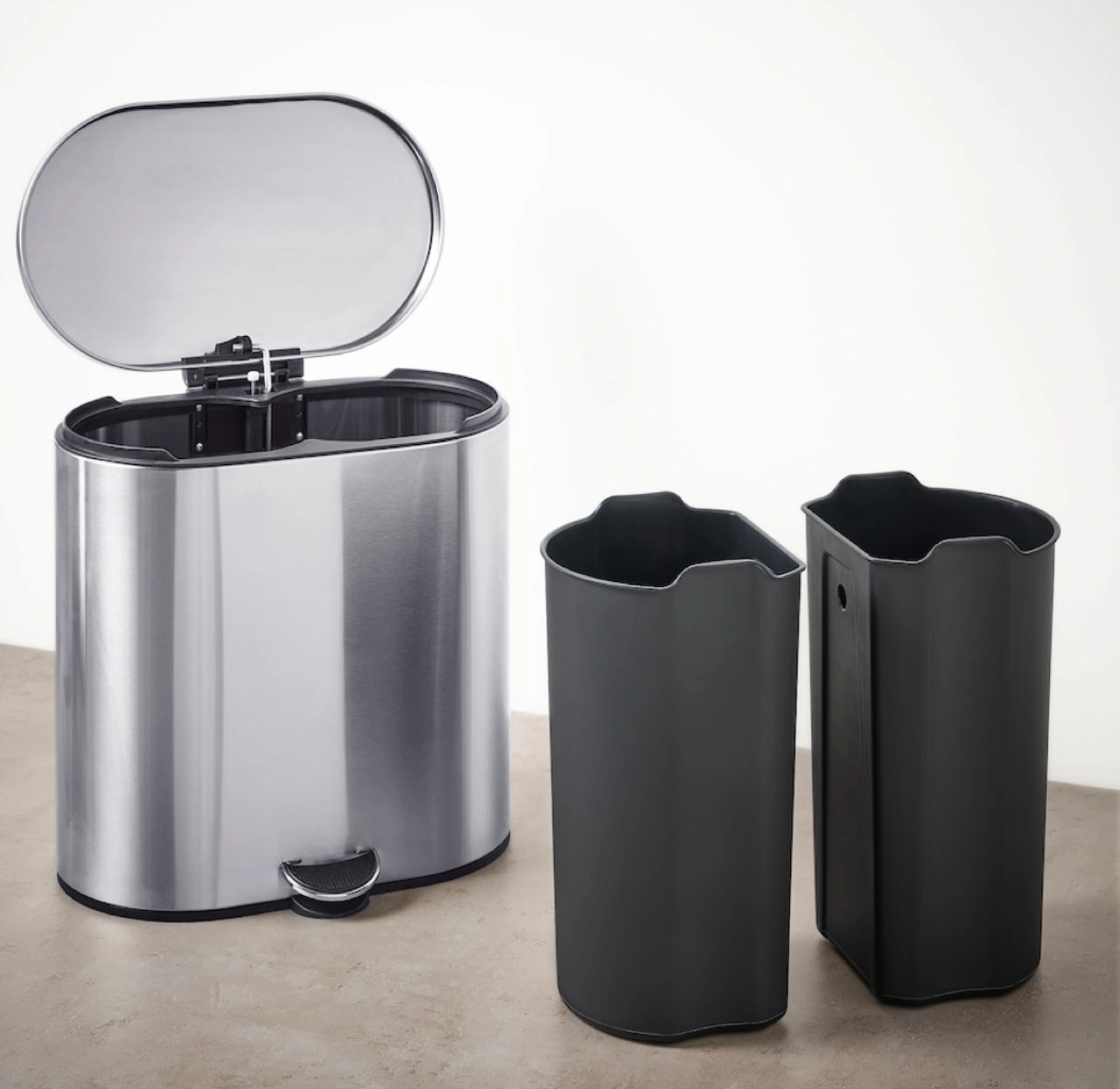 Oval-shaped stainless steel trash can. Two compartments for garbage and recycling. Foot pedal for easy opening. Removable inner bins.