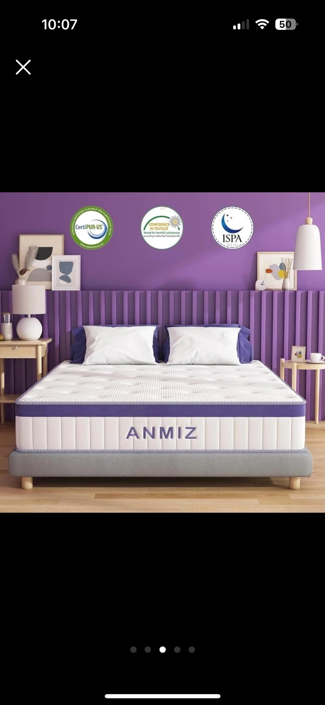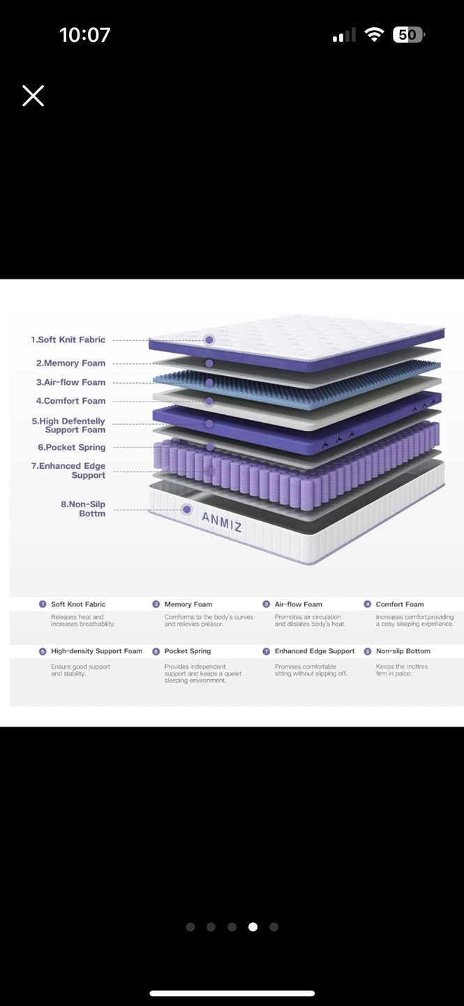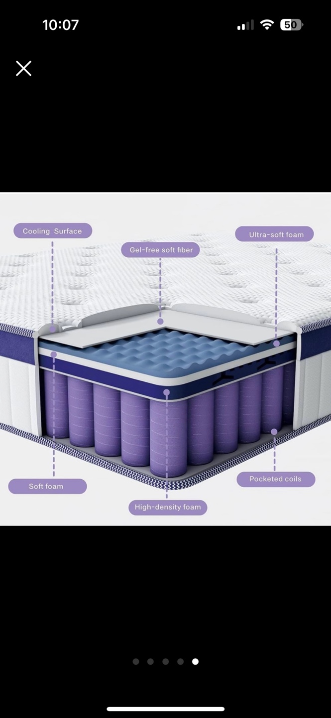 Memory foam, gel-free soft fiber, high-density foam, and pocketed coils. Non-slip bottom. 10 inch. Never used. BRAND NEWW!!!!! Move out SALEE!!!!