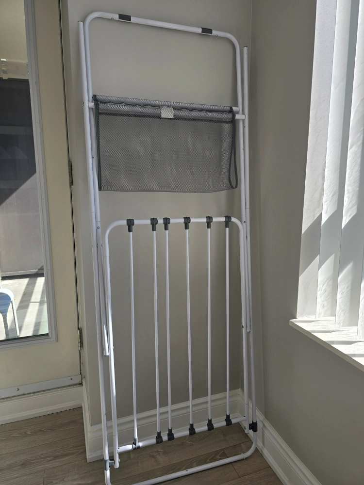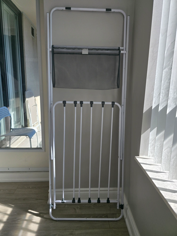 White foldable clothes drying rack. Features multiple drying rods and a bottom shelf. Ideal for apartments or small spaces. Collapses easily for storage.