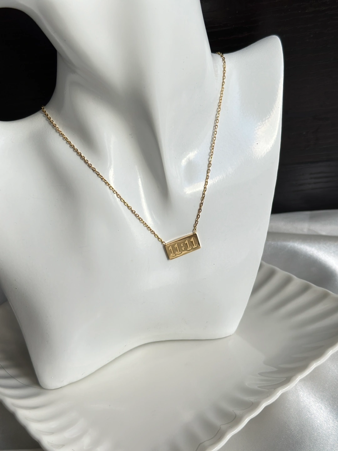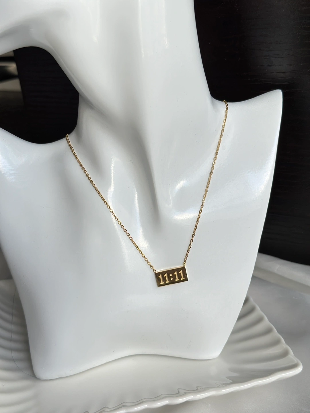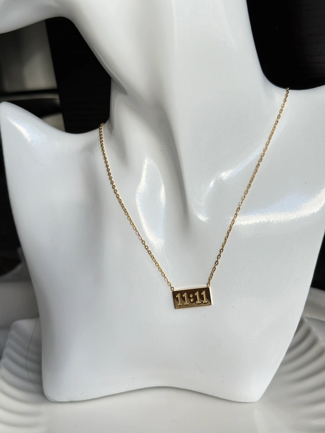 Delicate gold chain necklace. Features a small rectangular pendant engraved with 11:11. Minimalist design, perfect for everyday wear. Made of stainless steel Can be used in water Non tarnish and hypoallergenic