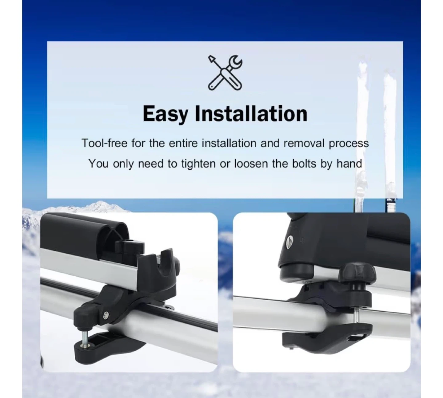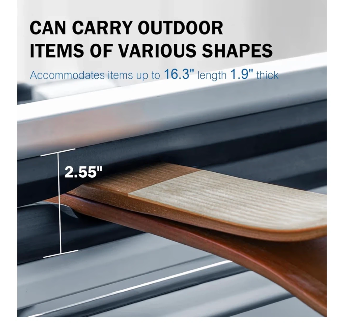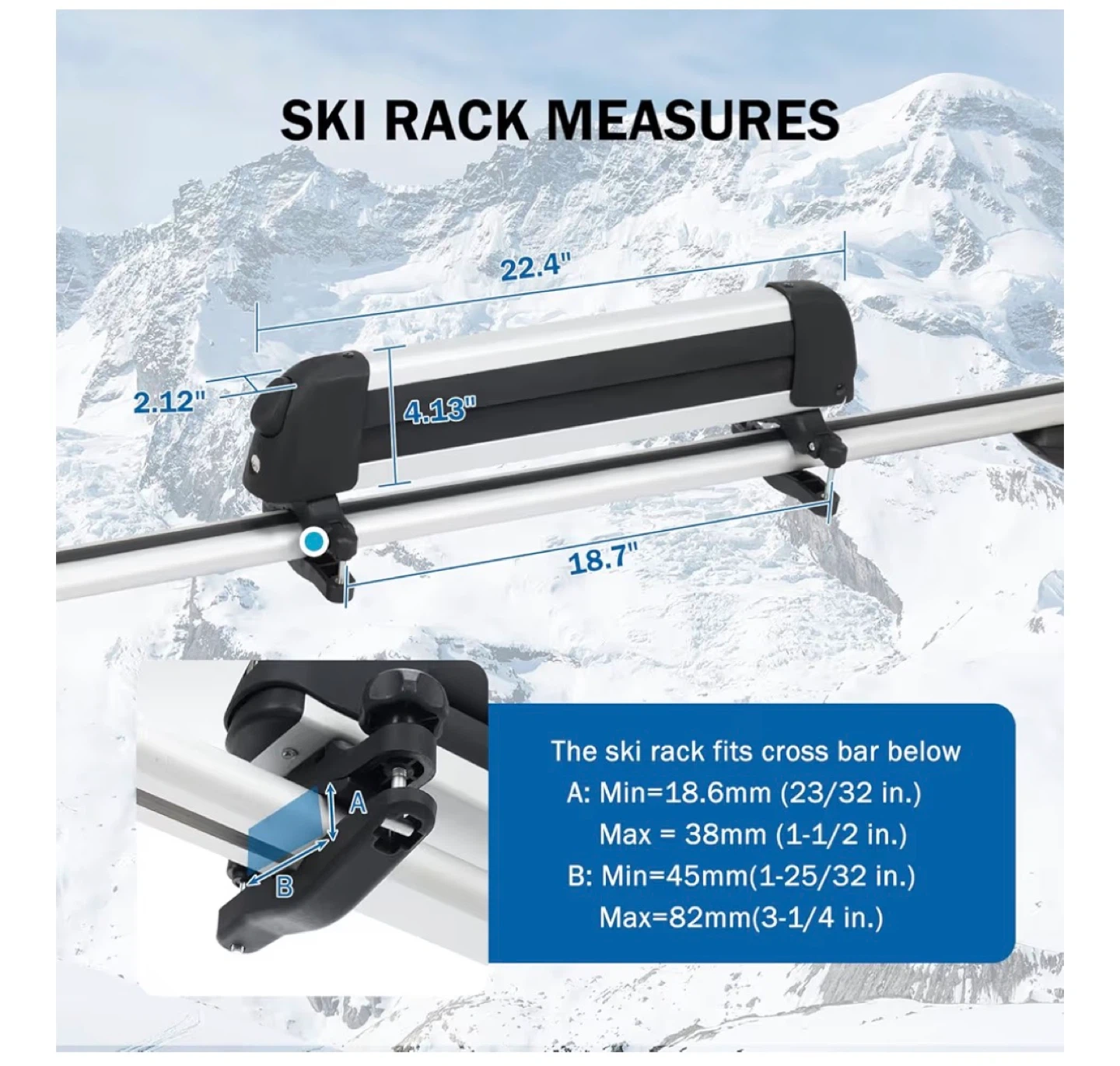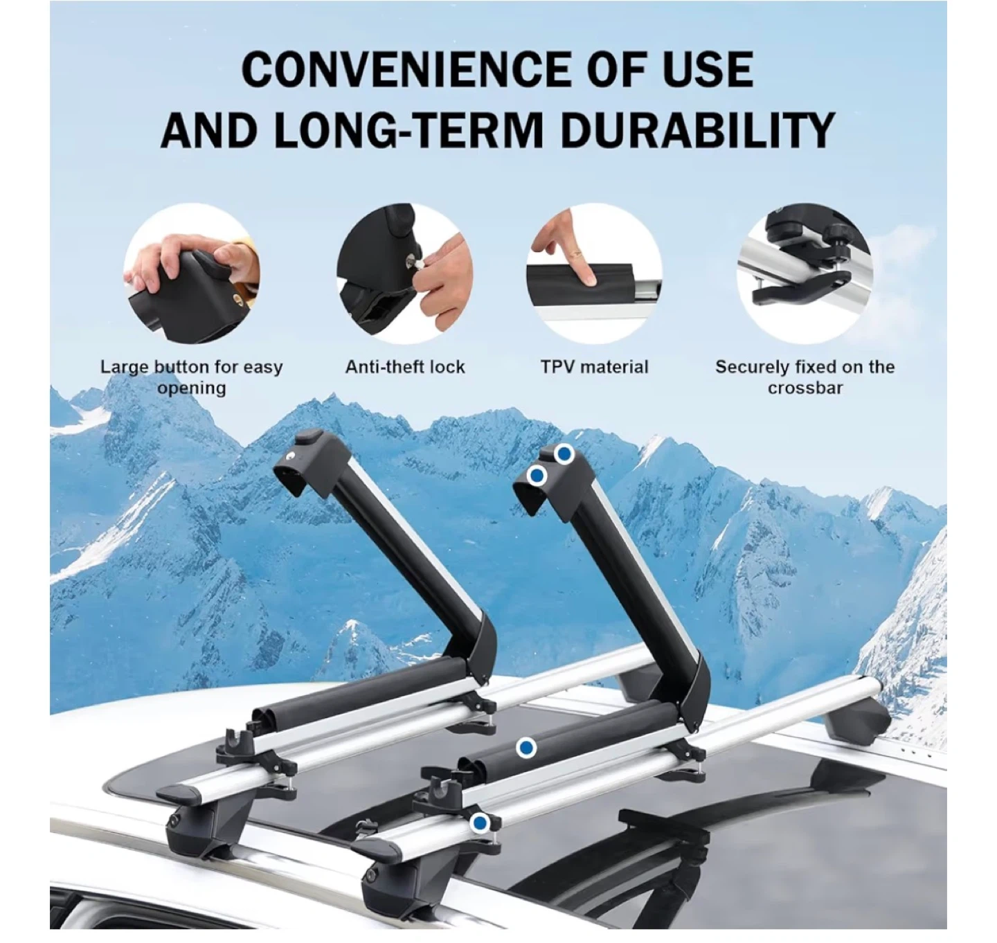 This ski rack is made of TPV material for long-term durability. It features an anti-theft lock and a large button for easy opening. It securely fixes onto the crossbar and can accommodate items up to 16.3" long and 1.9" thick. Fits crossbars between 23/32" and 3-1/4" wide.
