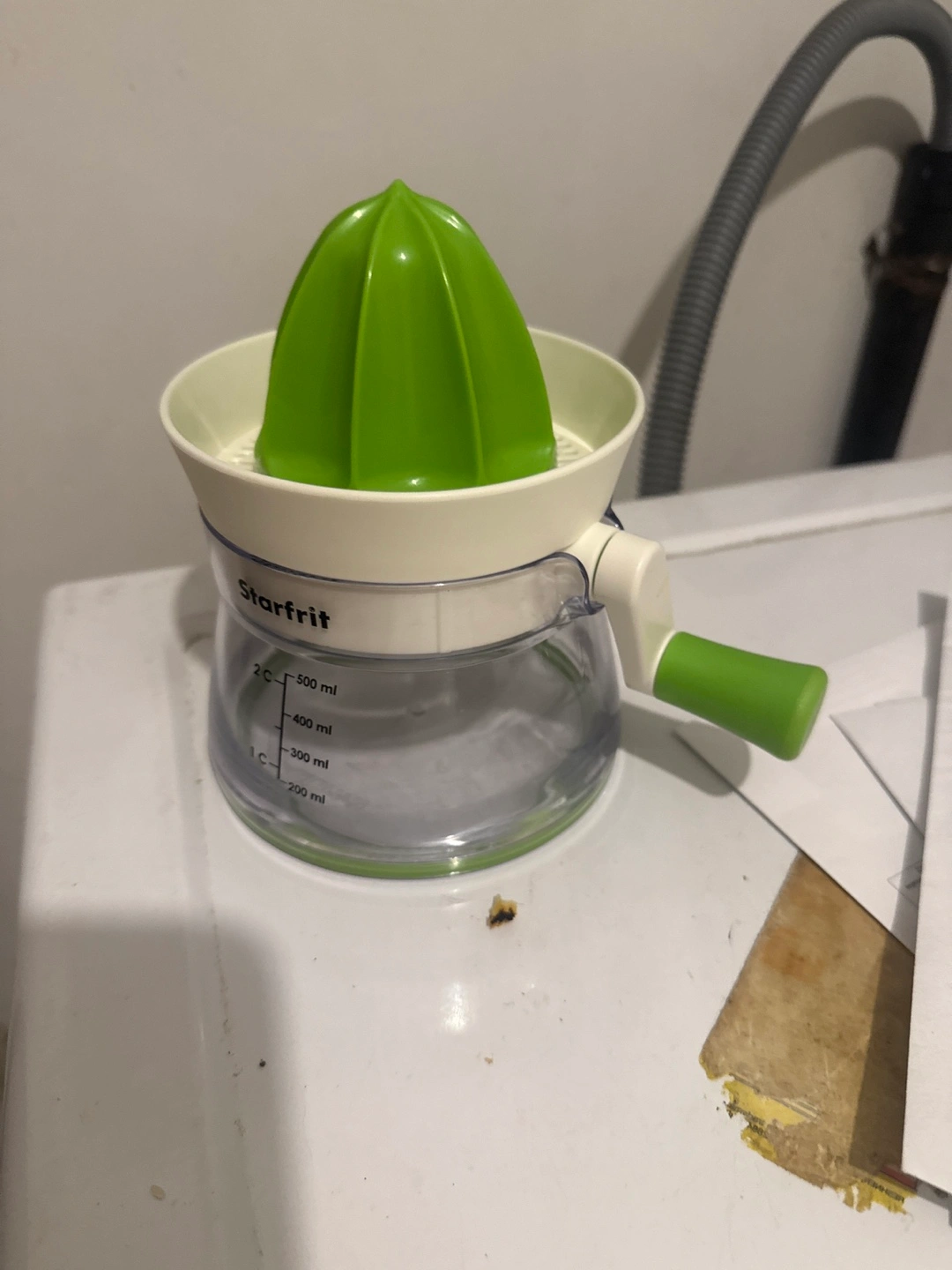 Manual citrus juicer. Green and white plastic. Measures up to 500 ml. Great for making fresh juice.