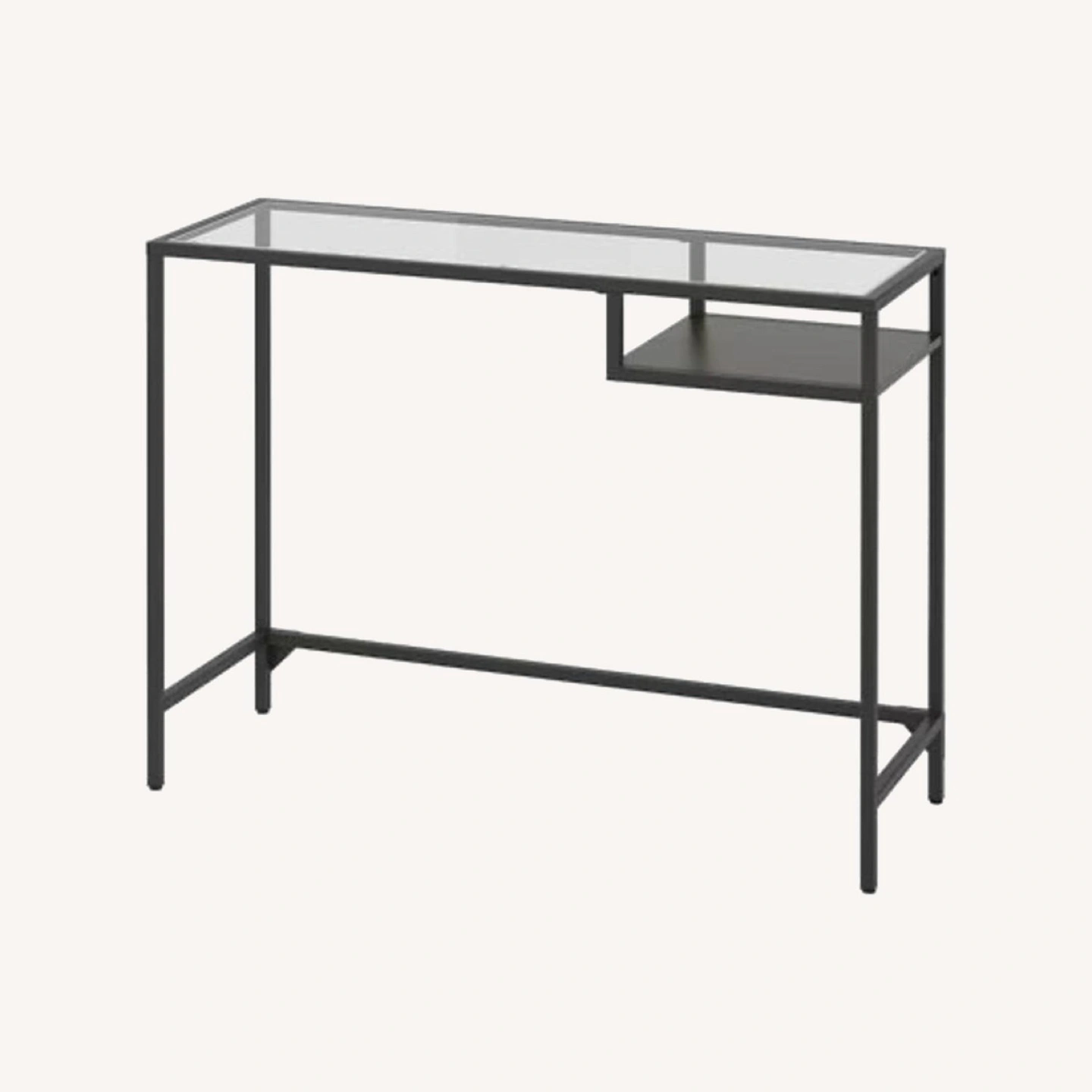 Modern console table with a glass top and metal frame. Small shelf included. Great for small spaces.