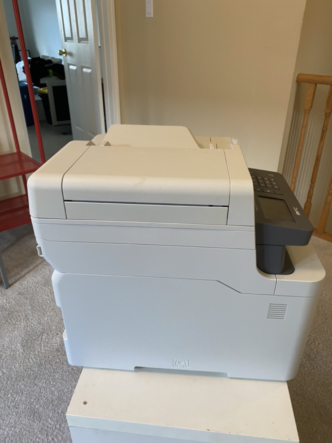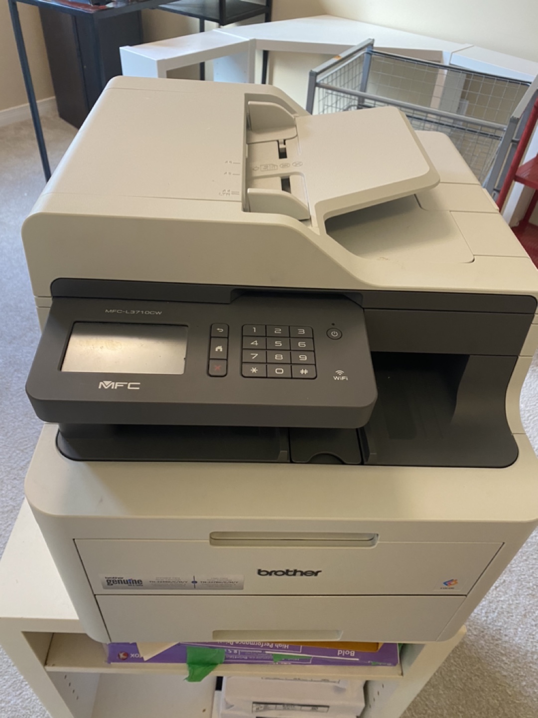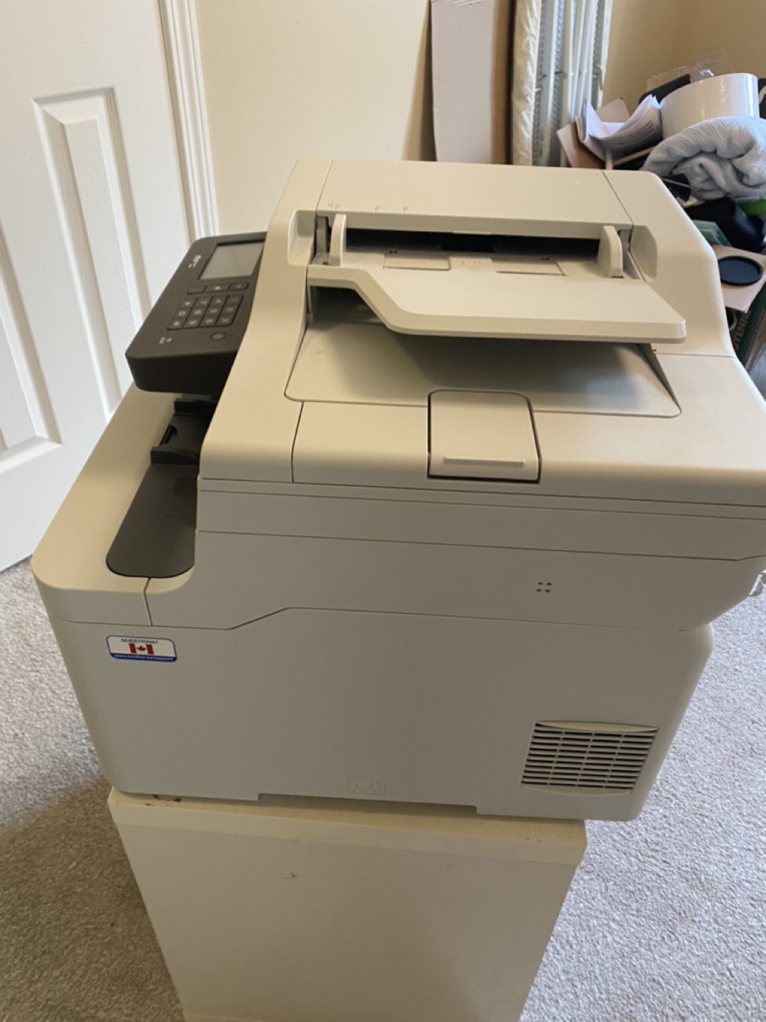Multi-function colour laser printer. Prints, scans, copies, and faxes. Wireless connectivity. Good condition.