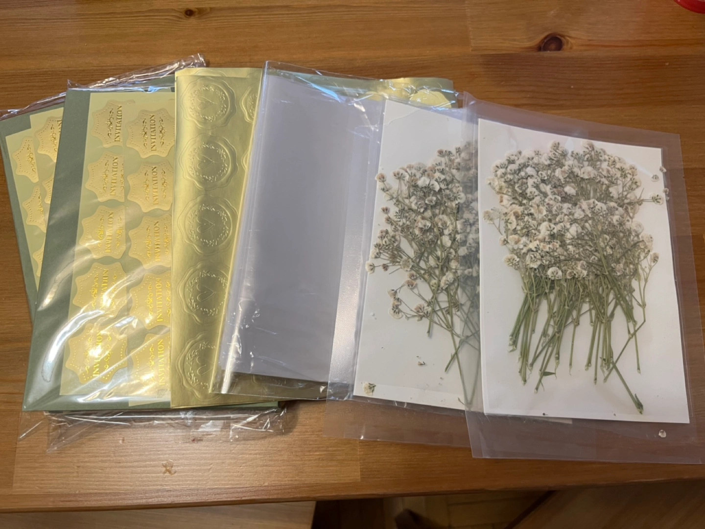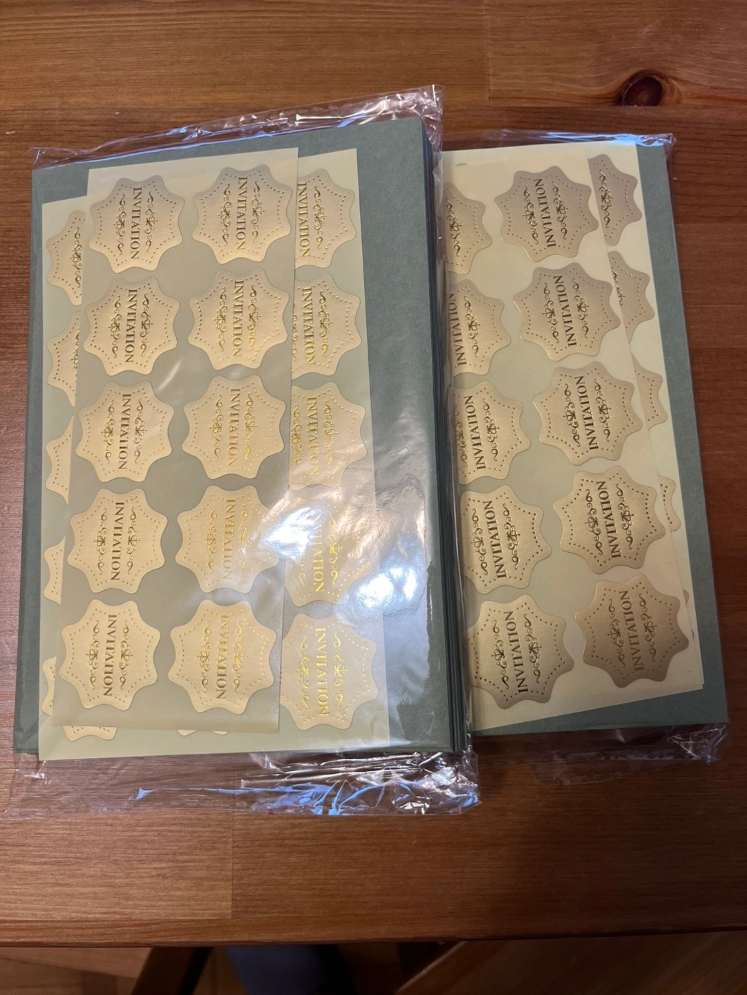 Gold foil invitation stickers, clear cellophane bags, and pressed baby's breath flowers. Perfect for DIY wedding invitations or other crafting projects. Several sheets of stickers included. Includes - 37 Pcs Pre Folded Vellum Jackets for 5x7 Invitations - 87 Pcs Natural Dried Pressed Flowers - 62 Pcs Gold Self Adhesive Envelope Seal Stickers for Craft DIY - 37 PCS/Pack A7 Envelopes, 5.25 x 7.5'' Sage Green Envelopes for 5x7'' Weddings Invitation Cards, Christmas Gift Cards, Acrylic Invitations, Photos and Any 5x7 Inserts