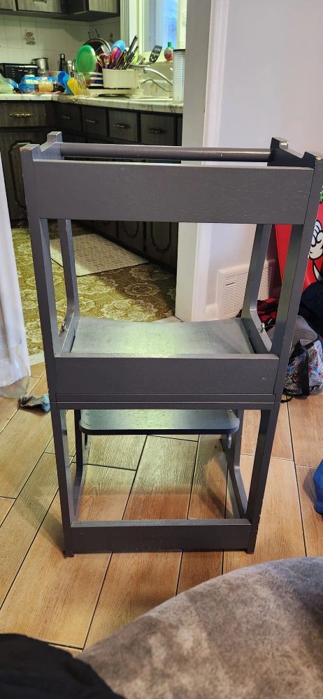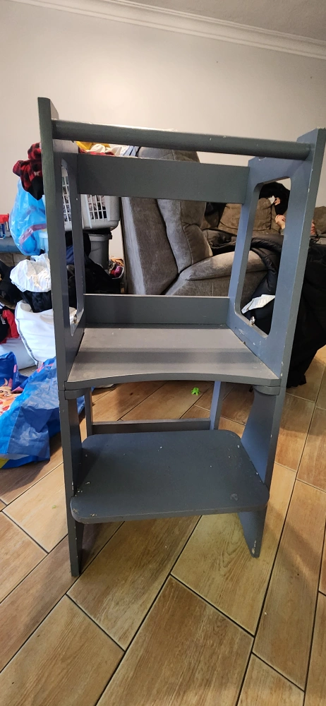 Gray wooden learning tower. Two shelves and a safety rail. Good for helping children reach countertops. Shows some wear.