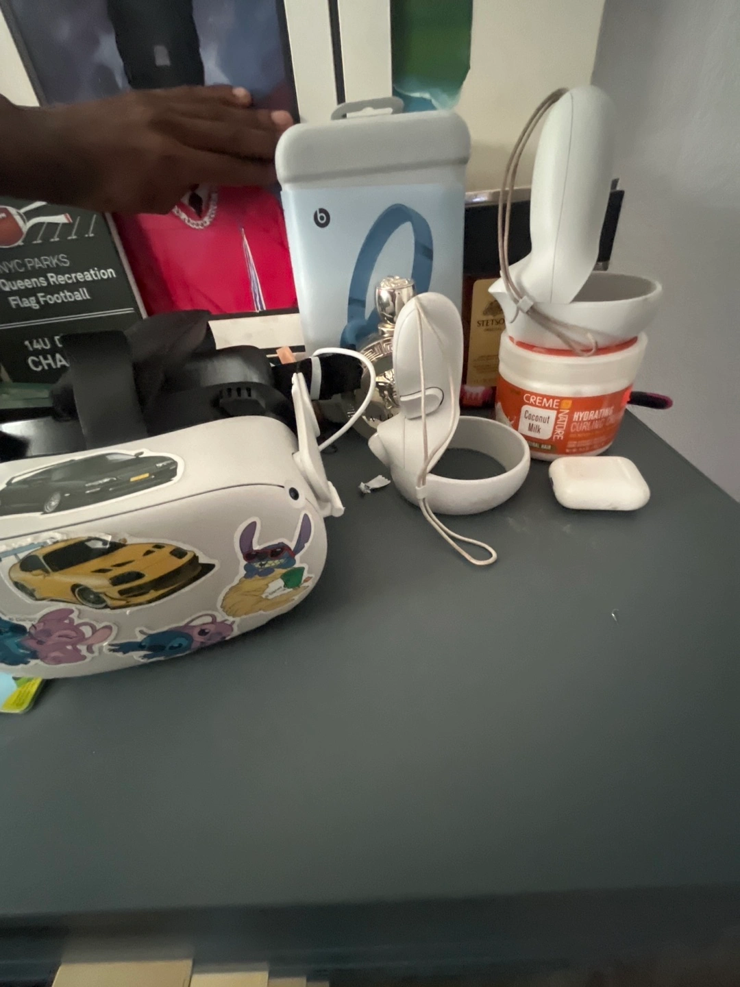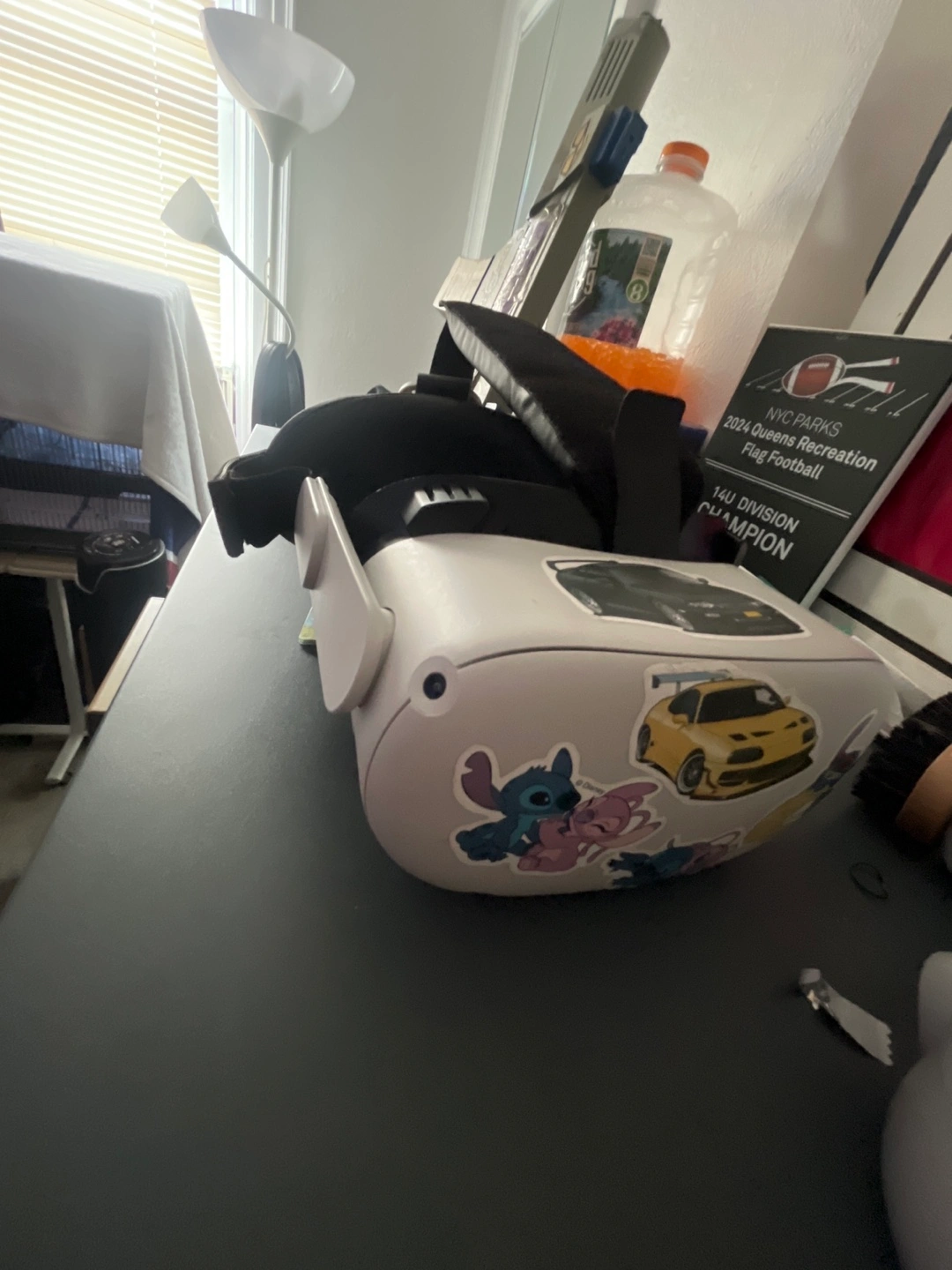White VR headset. Includes head strap and controllers. Some stickers applied. Used condition.