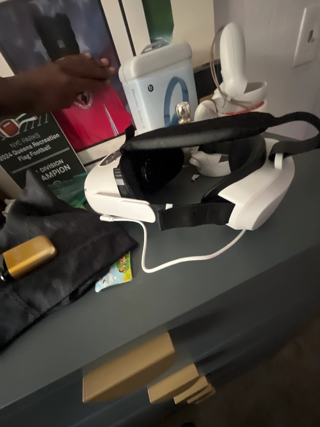 I got it for my birthday last year. I don’t use it. It comes with a head strap with a built-in portable charger and then go for like 300 to 500 and if it’s too far, I’ll meet up with y’all