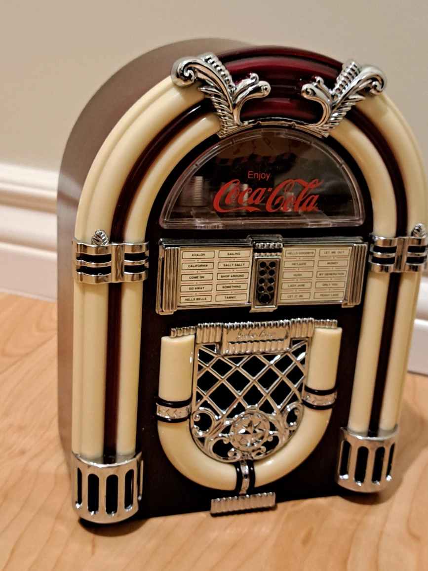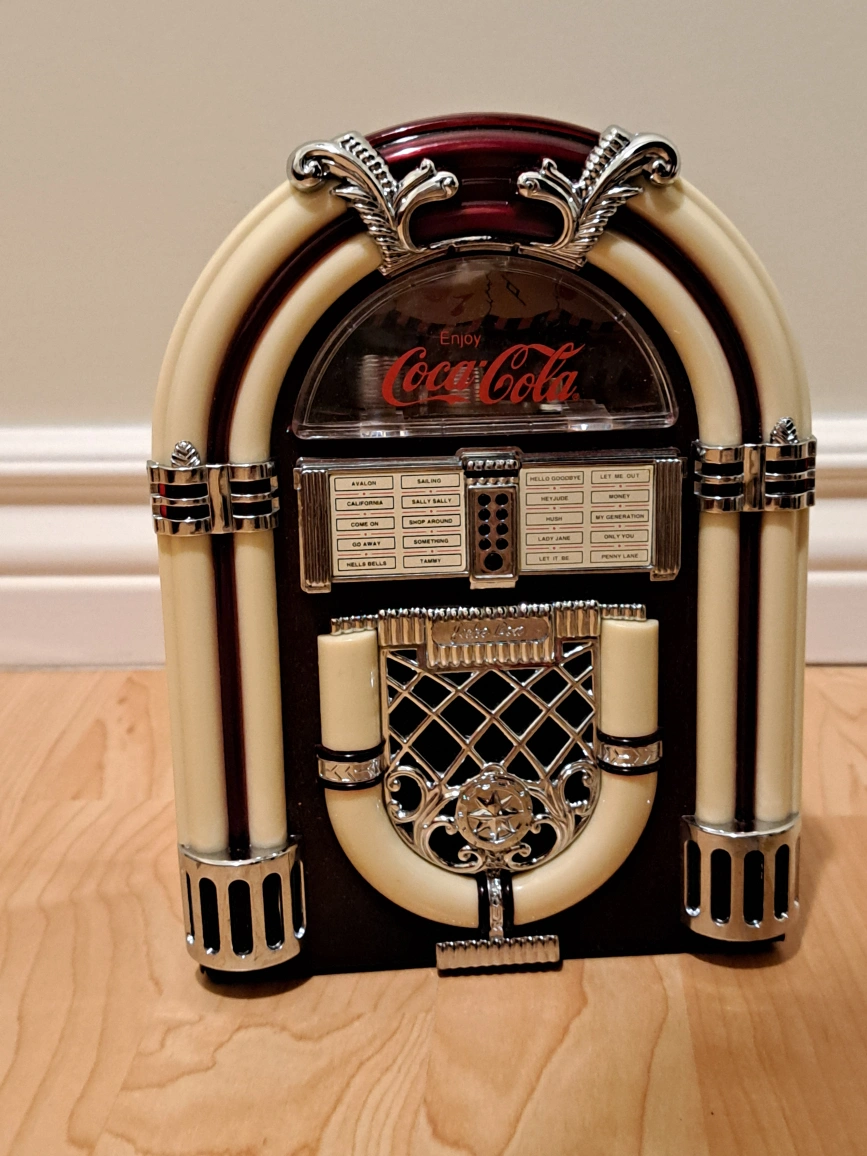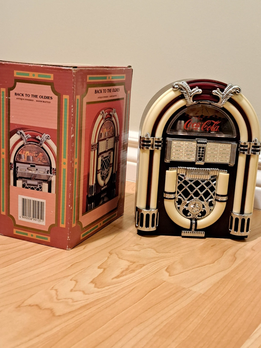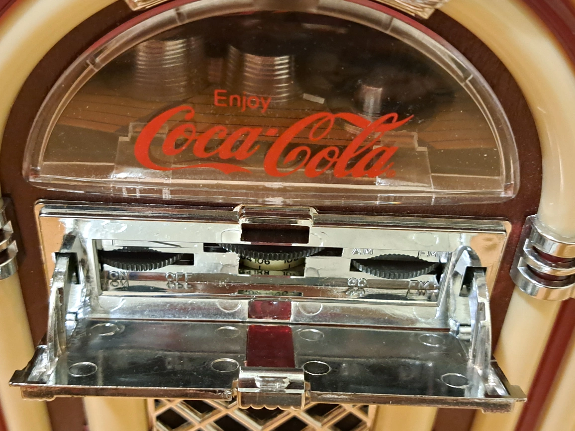 570Collectible miniature jukebox. Plays Am/Fm radio. Coca-Cola branding. Includes original box. Back to the Oldies collection.