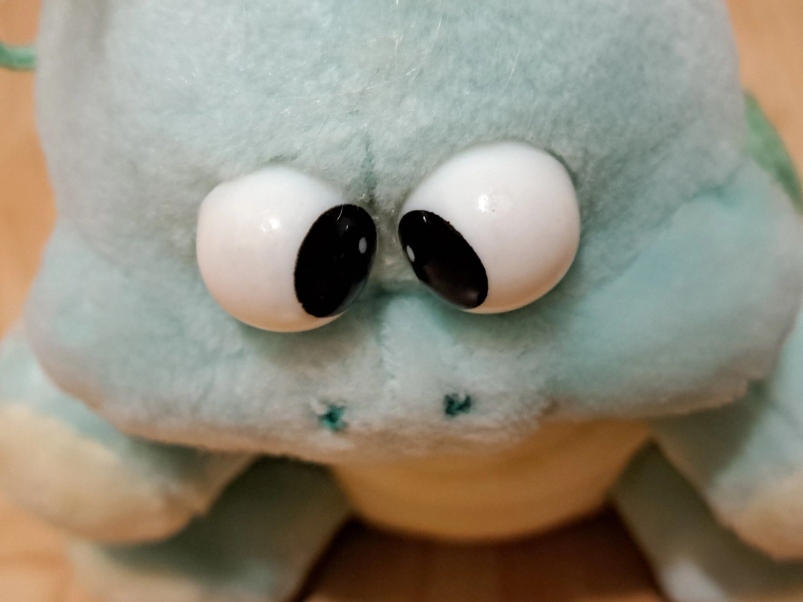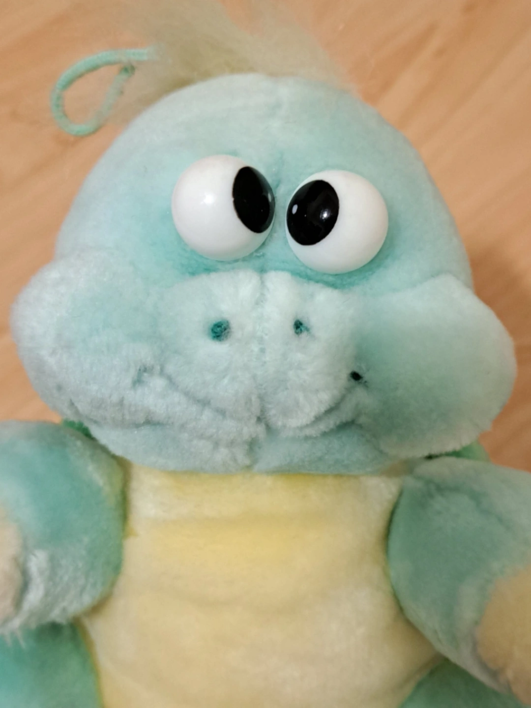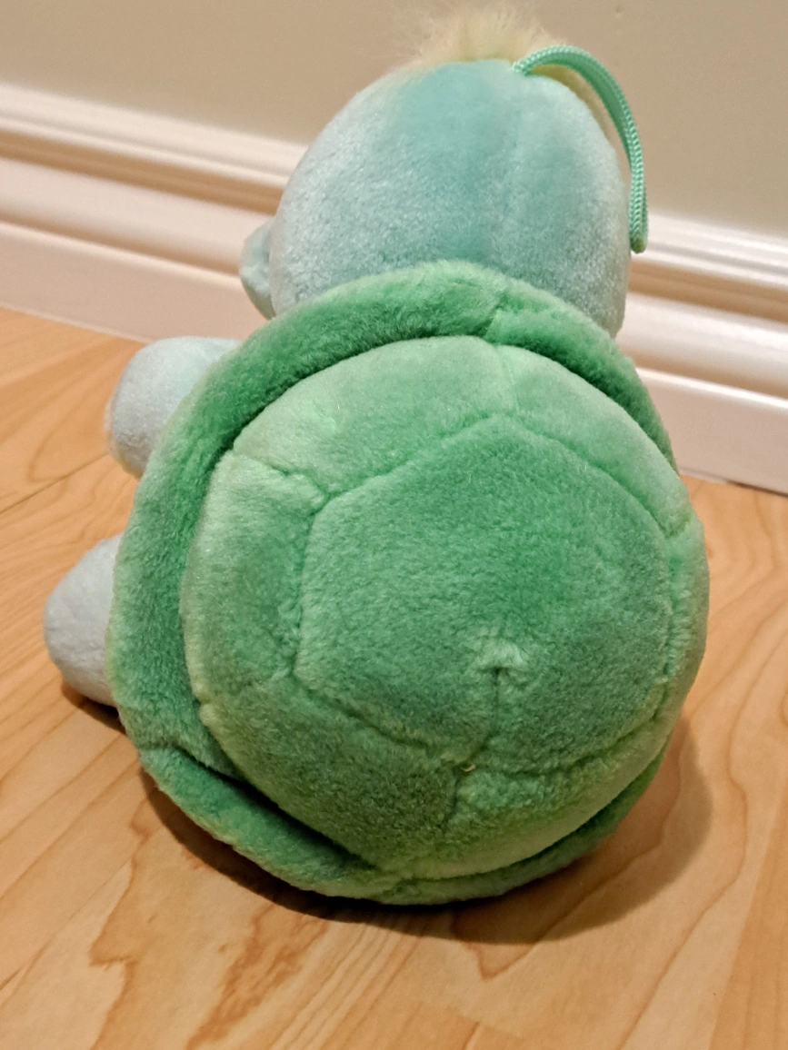 Adorable vintage plush turtle. Features large eyes and a soft green shell. Small loop for hanging. Collectible toy.