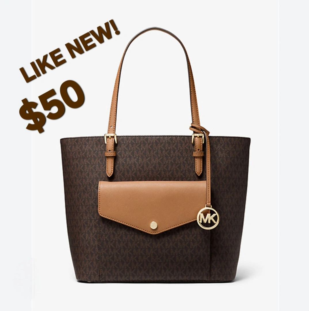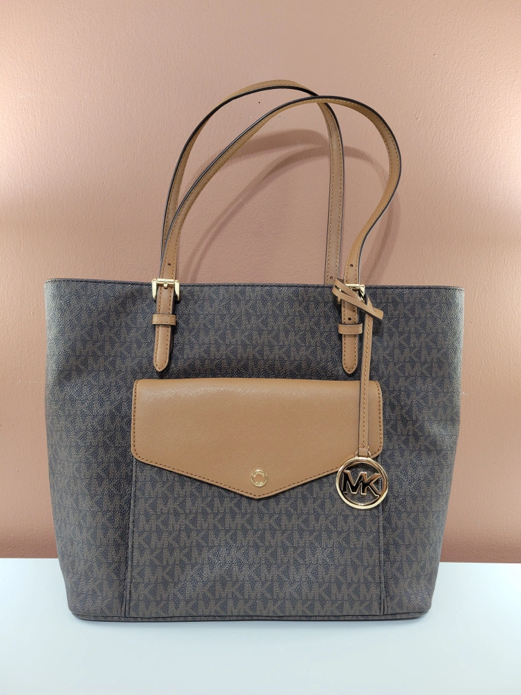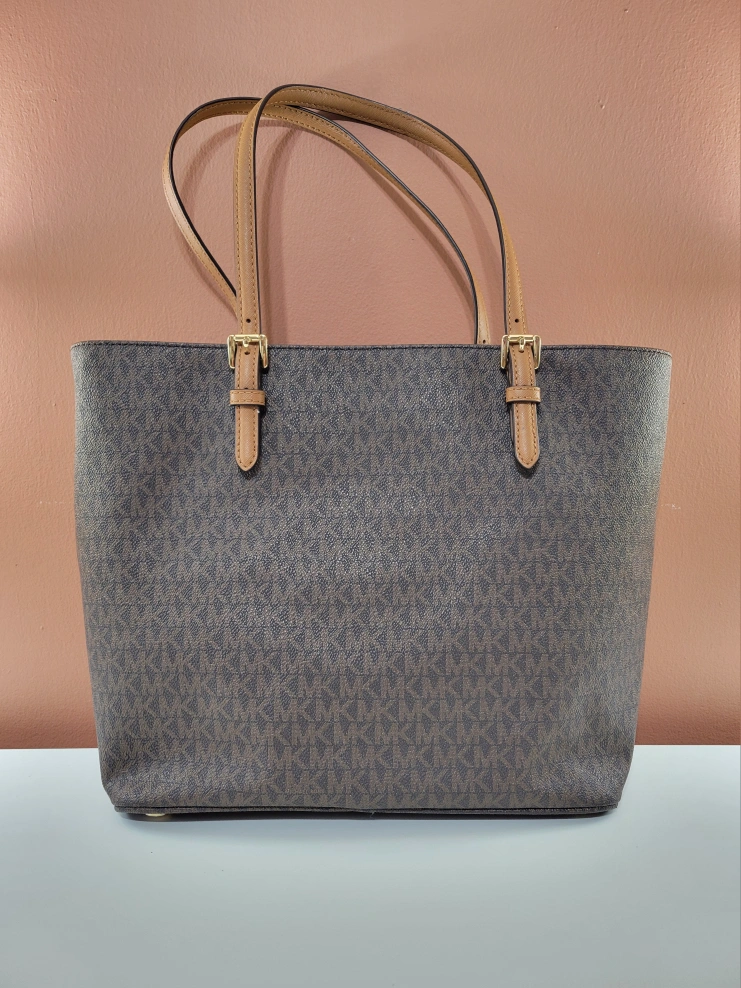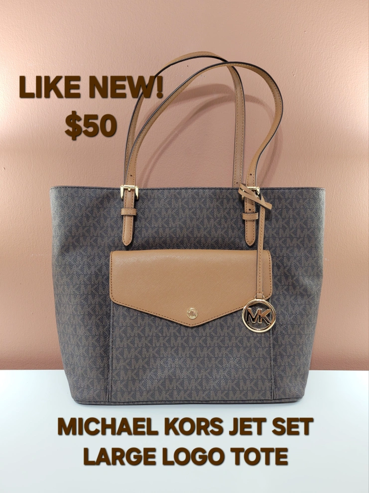 254Michael Kors Jet Set Large Logo Pocket Tote Bag -From: Michael Kors Niagara Falls 🇨🇦 -AUTHENTIC MICHAEL KORS TOTE -VERY EXCELLENT CONDITION! -LIKE NEW! BARELY USED! -Size: Large -Colour: Dark brown with Camel brown accents -Pattern: MK initial logo -Open top with 2 top handles -Gold hardware -3 Large inner compartments -Snap closure outer pocket featured on front -Excellent for school/work (holds mid-size laptop easily) or as a diaper bag... very versatile piece! 📸PLEASE SEE PHOTO GALLERY FOR MORE DETAILS ABOUT THIS ITEM📸 Asking only $50 (FIRM & FINAL) 💰CASH PREFERRED, PLEASE💰 ‼️AVAILABLE FOR A LIMITED TIME‼️ ⚠️Please only message if you are SERIOUS about buying AND you know when you'd like to pick up.⚠️ 🚙Located in North Oshawa BEATRICE & RITSON area.🚙 ⏰️No holds longer than 2 days.⏰️ ❗️POSTED ON VARAGESALE, KARROT, & MARKETPLACE❗️
