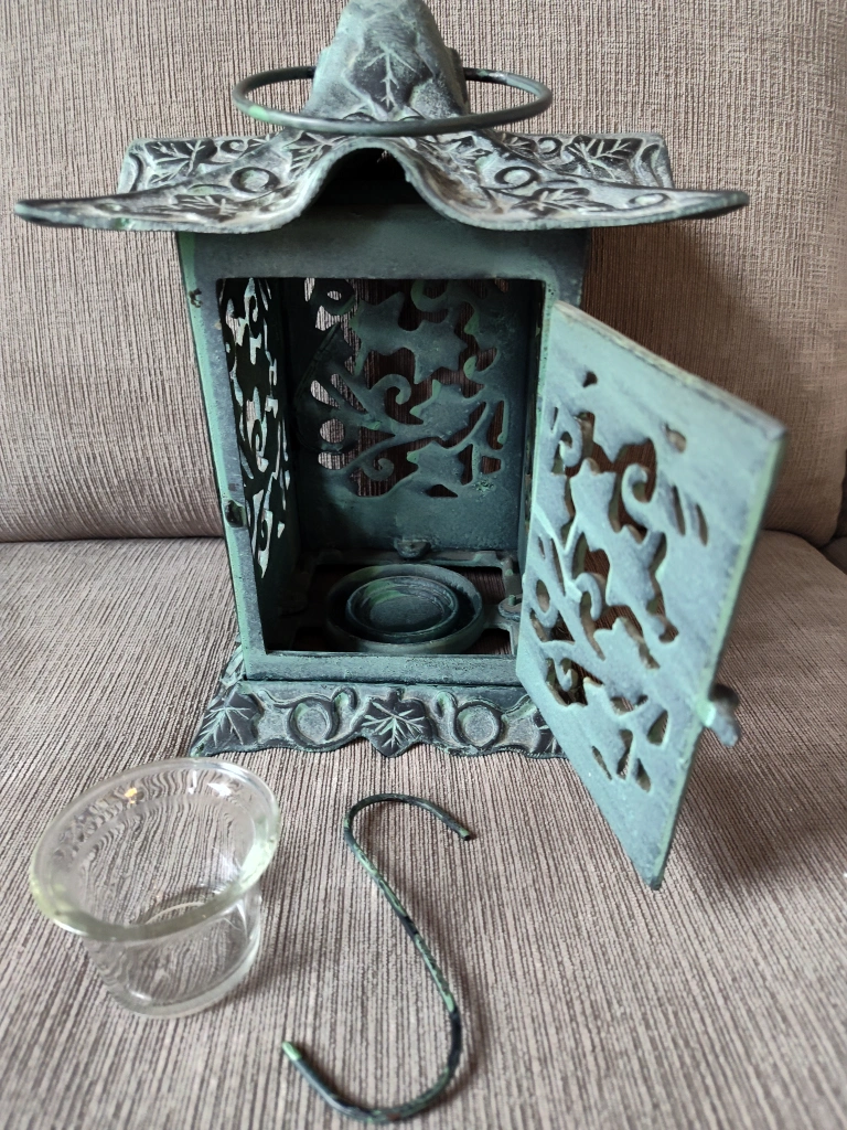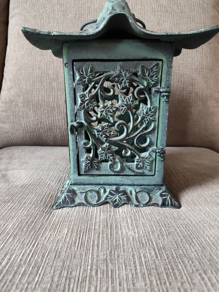 PartyLite cast iron lantern. Green patina finish. Intricate leaf detailing. Small glass candle holder and hanging hook included. Use with votives or twinkle lights. 10 inches height, quite heavy. p/u Streetsville
