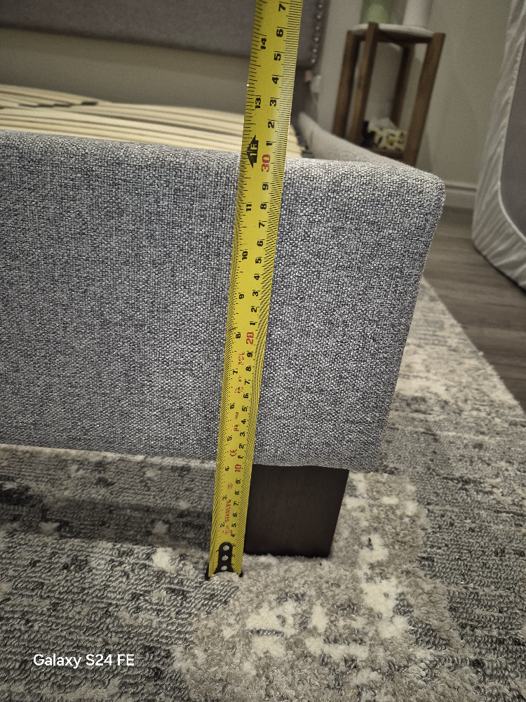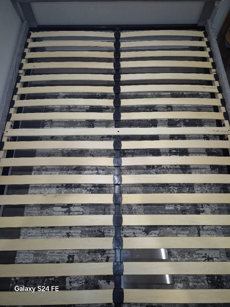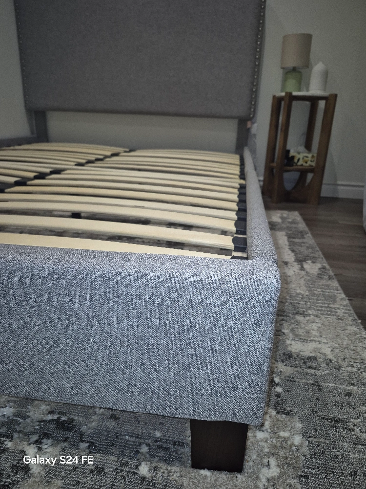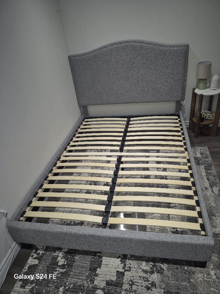 Double size bed frame. Grey fabric upholstery. Sleigh style headboard. Wooden slats included. Dark brown legs.