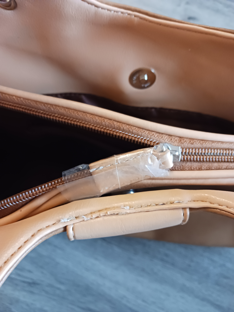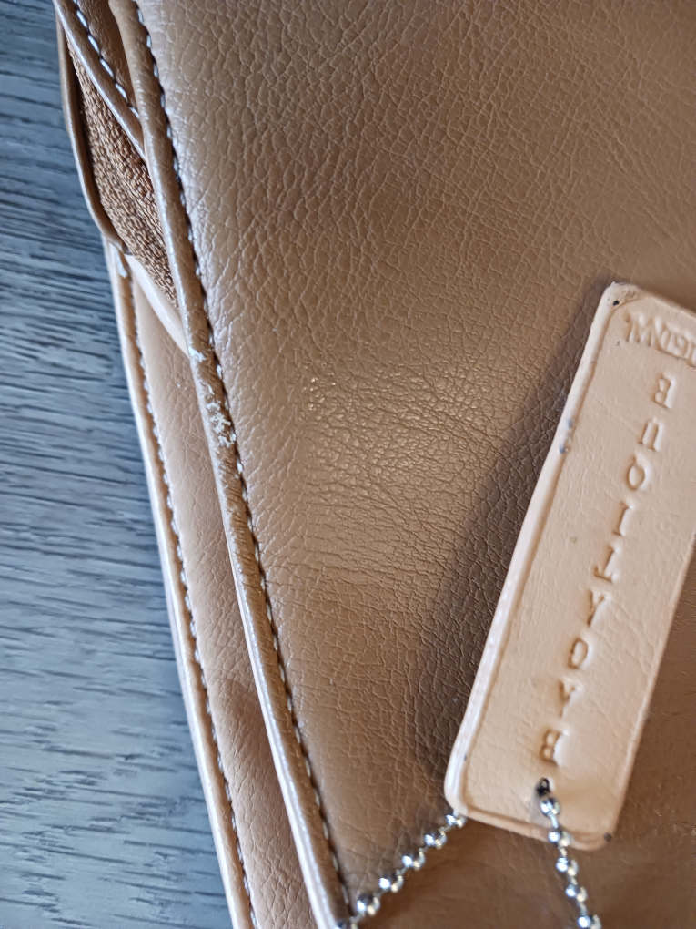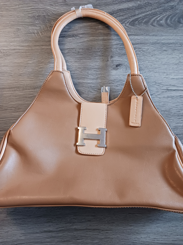 Tan coloured handbag. Features a silver H clasp. Zipper closure. Interior pockets. Small handbag, suitable for everyday use. Brand new, but has some abrasions ( see picture)