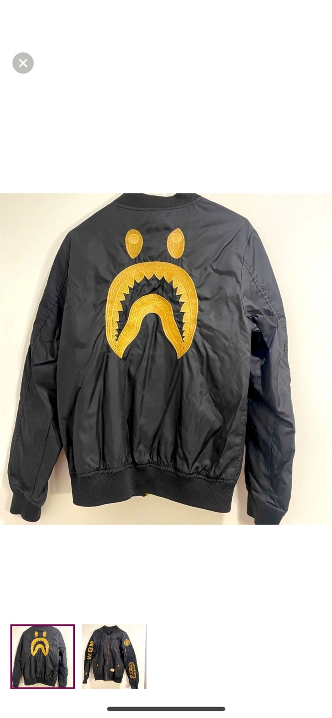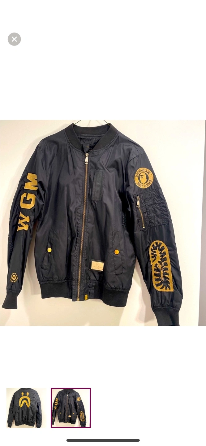 Black bomber jacket. Gold shark embroidery on the back and sleeves. WGM lettering on one sleeve. Zipper closure. Pockets. Completely flawless. Comes from a pet green smoke free home. Purchased for $375. Stylish black bomber jacket with gold accents, perfect for a modern look. Features unique patches and a sleek design.