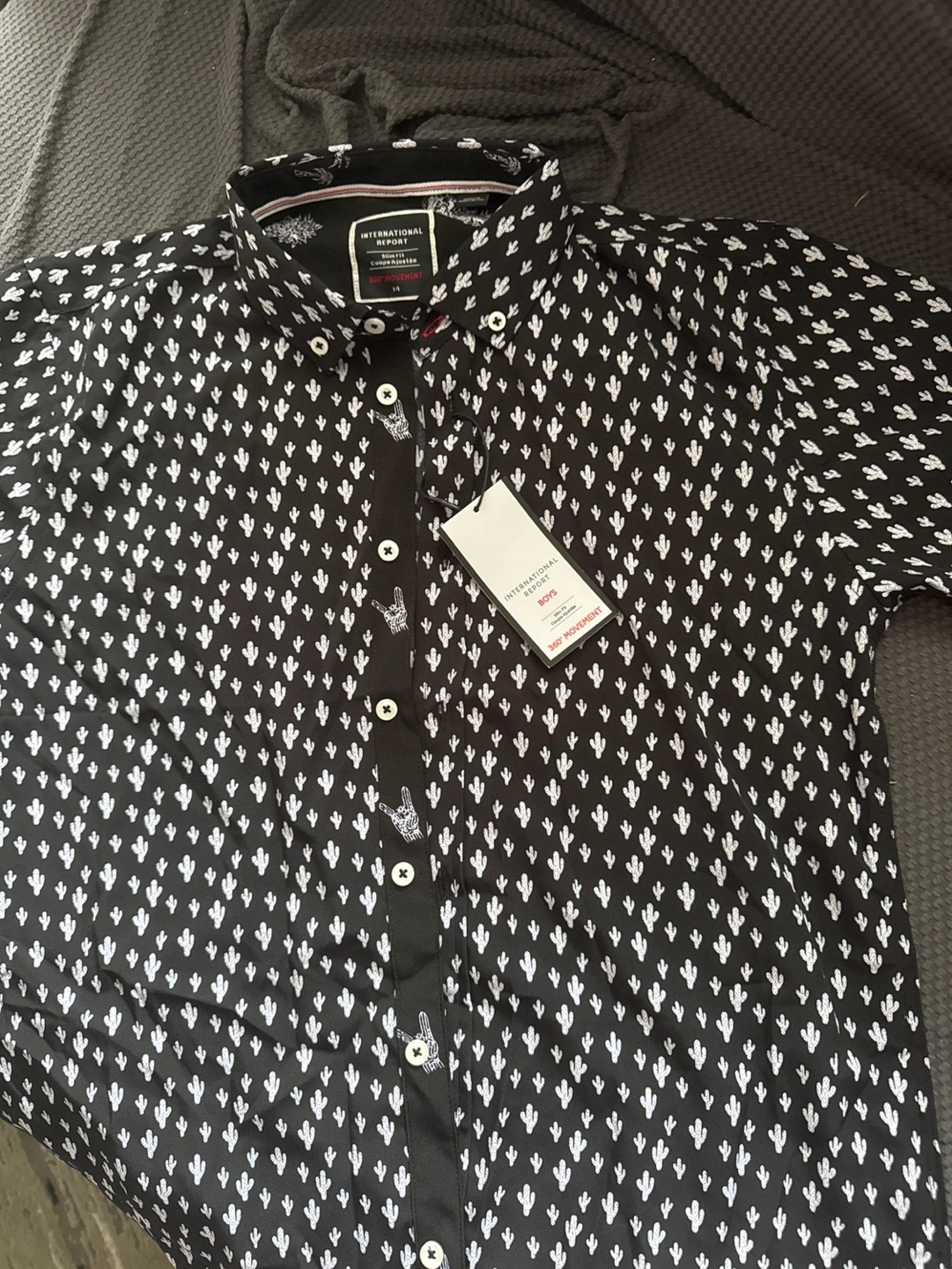 Boys' short sleeve button-down shirt. Black with white cactus and hand symbol print. Size 14 Brand new shirt.