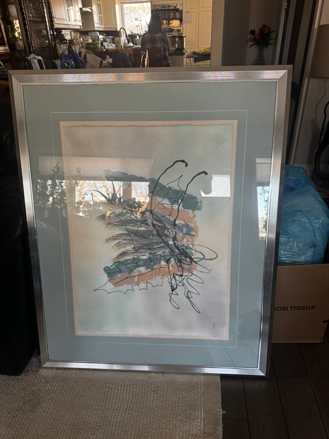 105Large framed art ready to hang. Art is made of fabric in pastel colour. Bought from Renwil Inc. Cash and pick up only. Pick up at Jane and Dundas west (upper bloor west area). If the ad is up, it is still for sale.