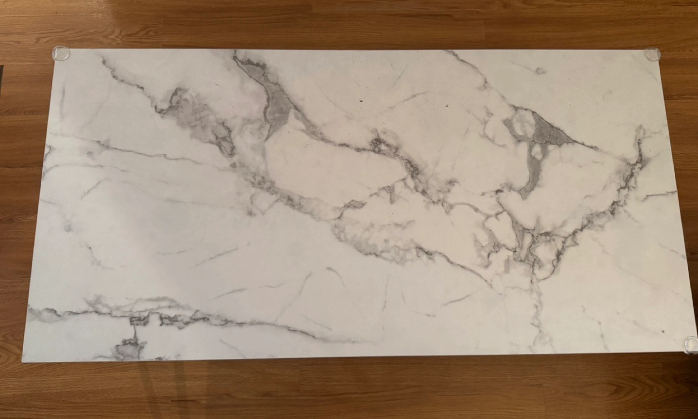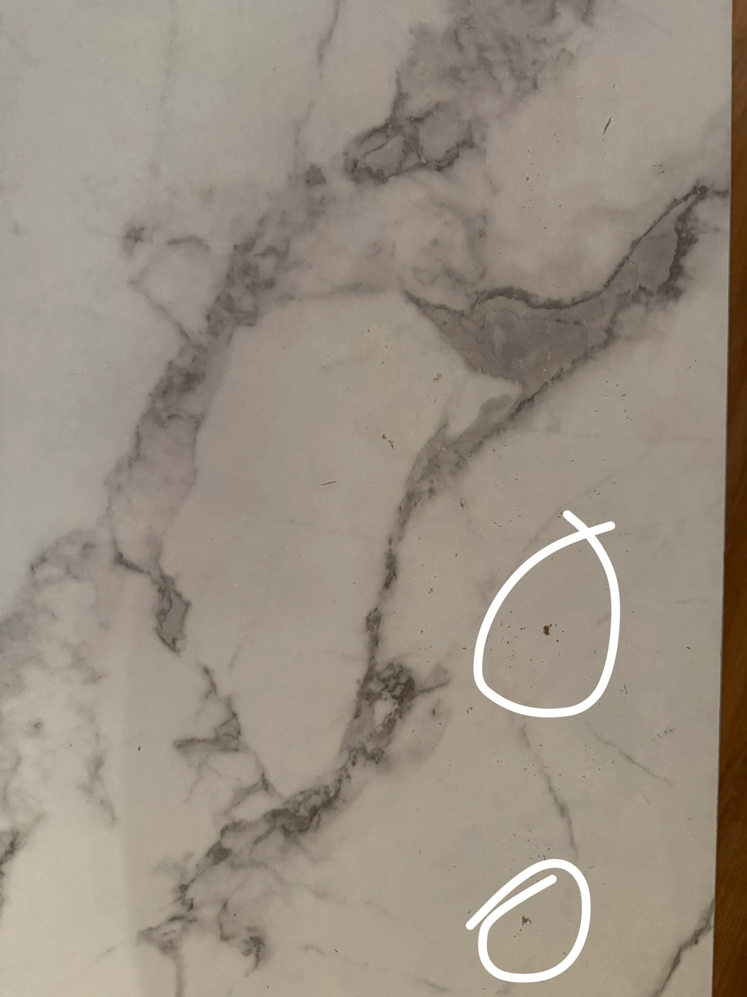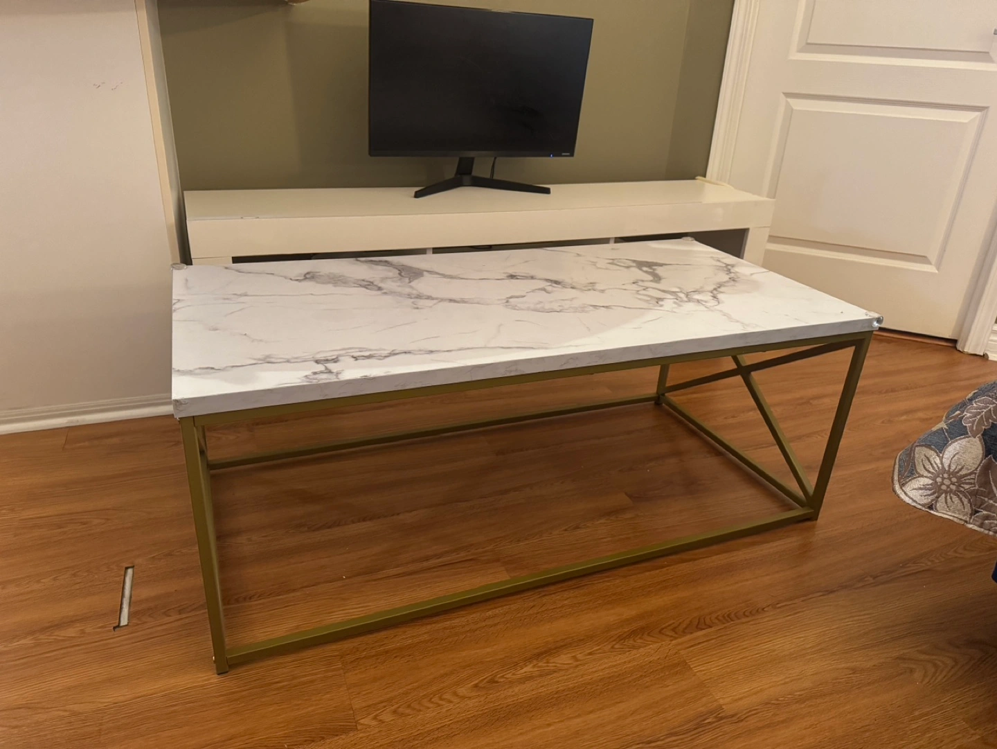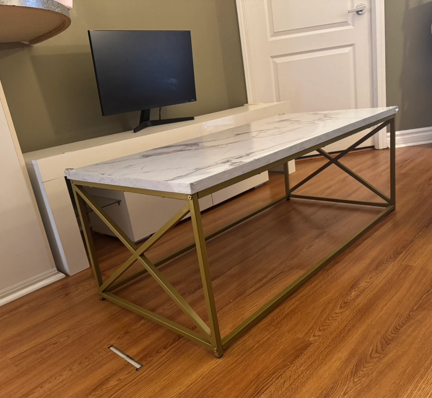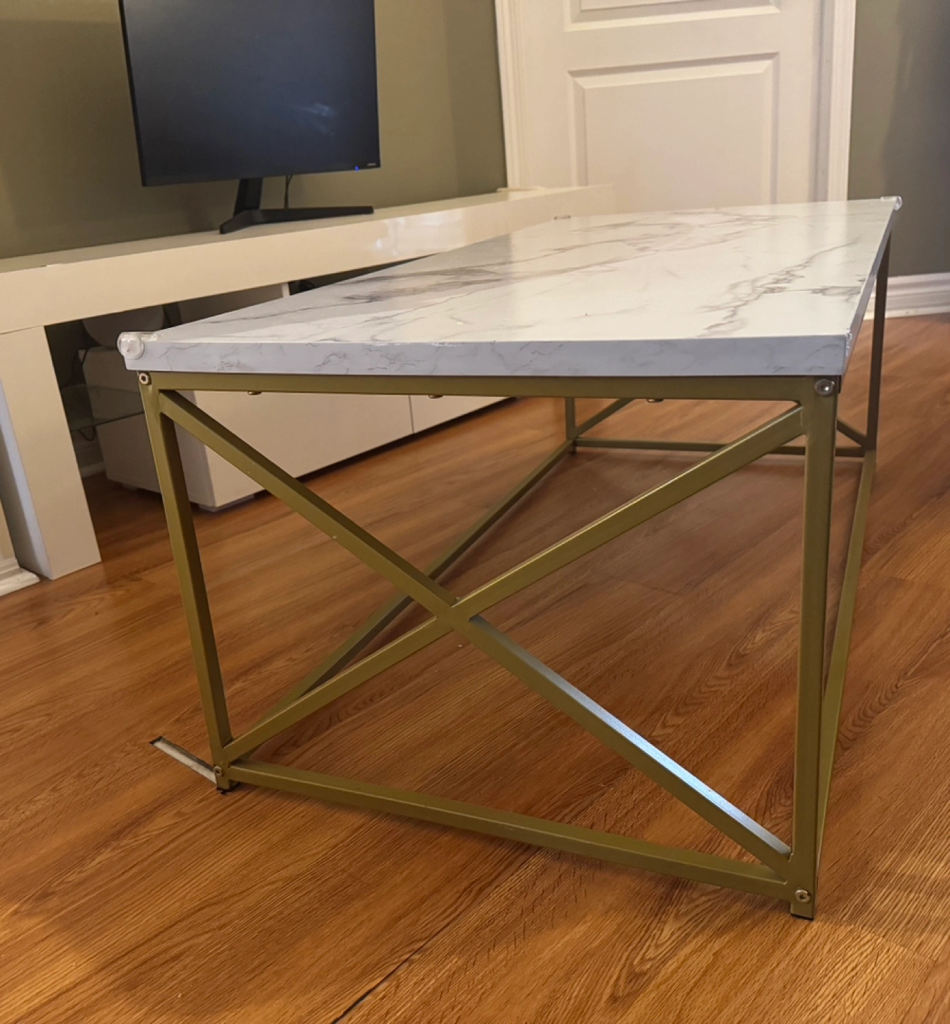Modern coffee table. Gold metal frame. White marble-look top. Minor imperfections.