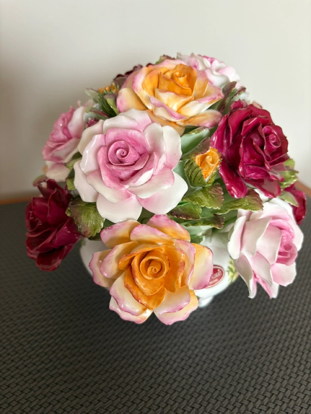 Features a bouquet of 15 roses in various colours. Detailed craftsmanship. Lovely home décor piece.