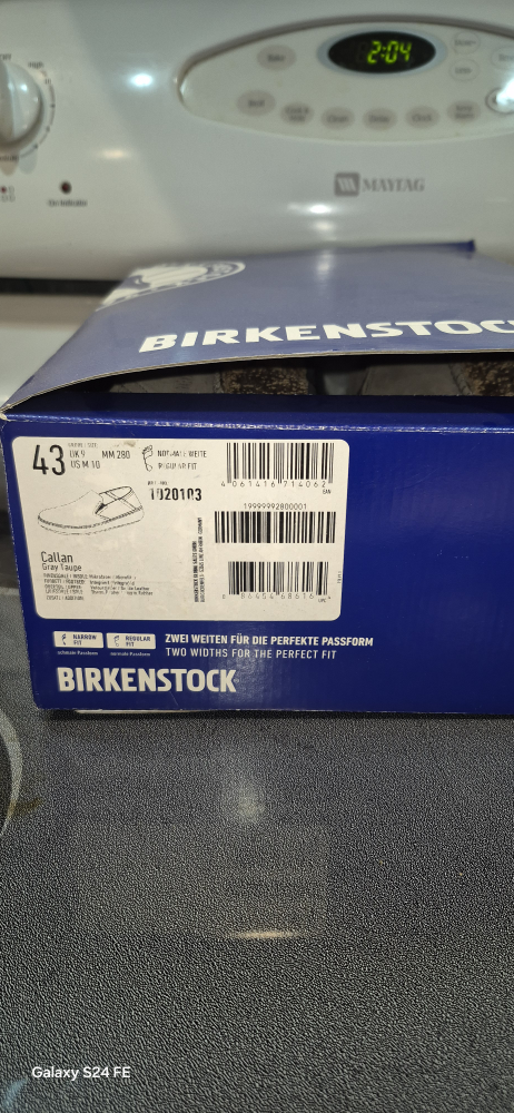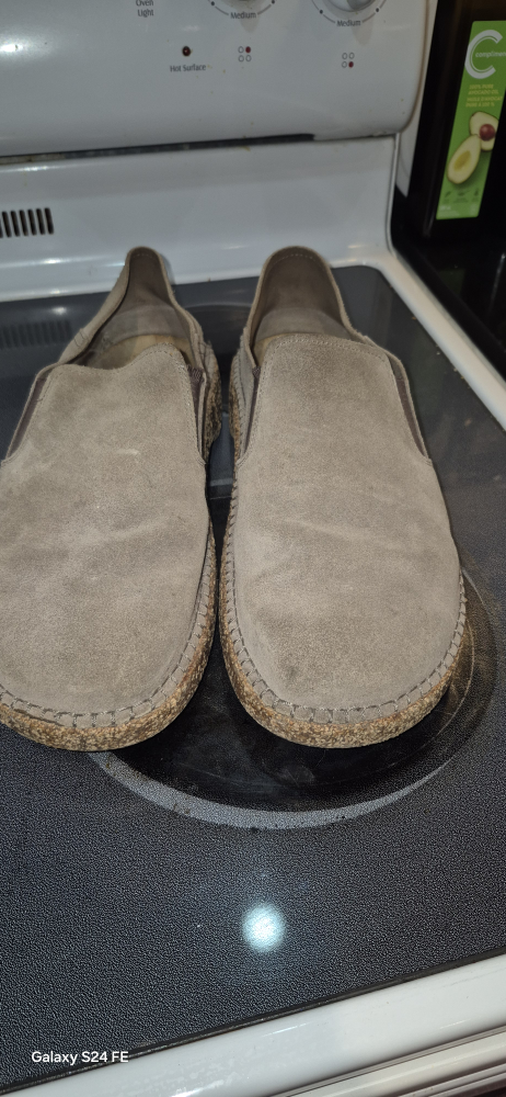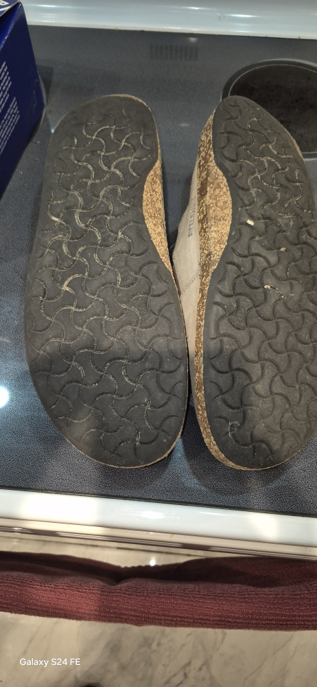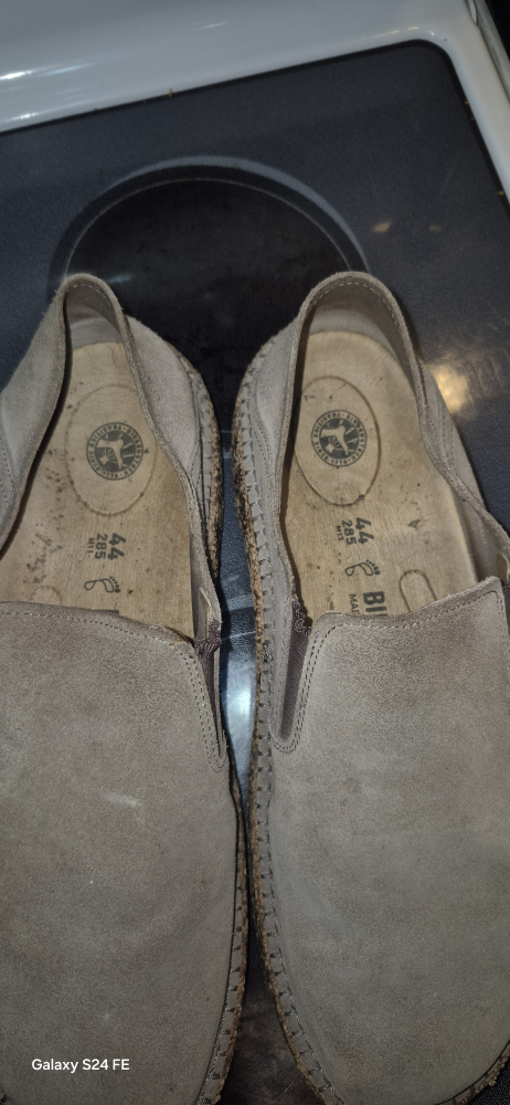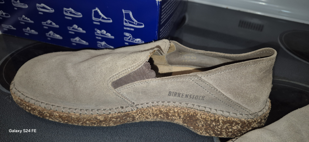 Gently used Birkenstock Cailan slip-on shoes. Grey suede upper, cork sole. Size 44.