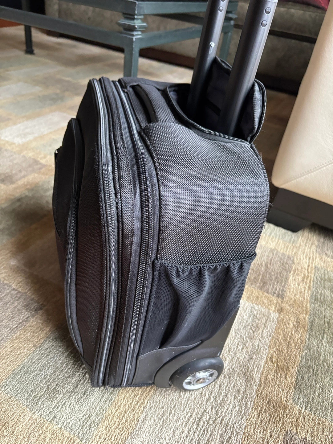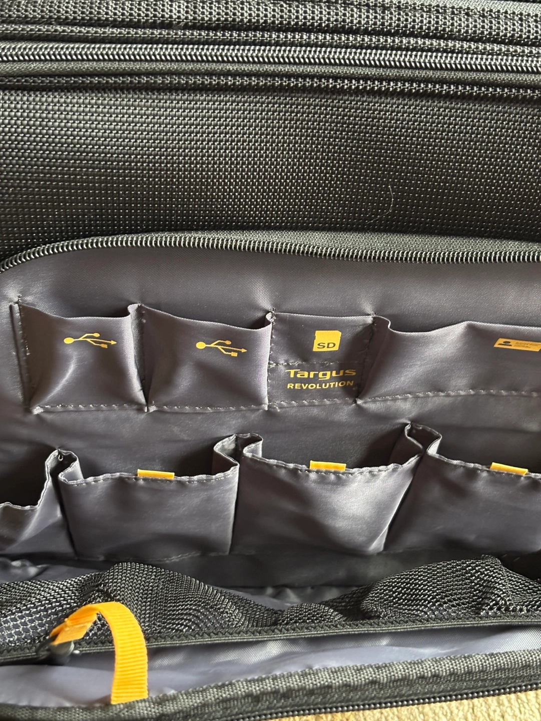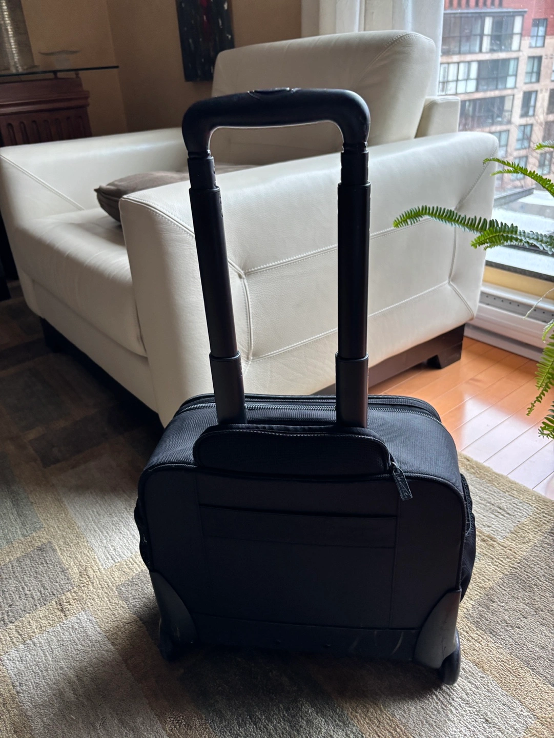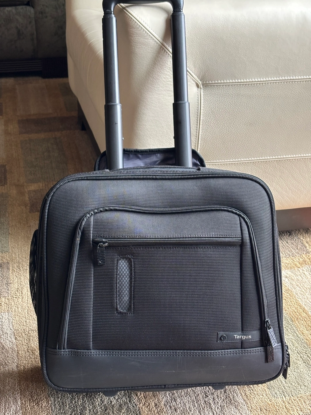 979Black rolling laptop case by Targus. Multiple compartments and pockets. Ideal for travel or business. Durable construction. Wheels and retractable handle. Used lightly and in great condition. From a smoke and pet free home. Pickup only in the St Lawrence market area of downtown Toronto. Cash only.