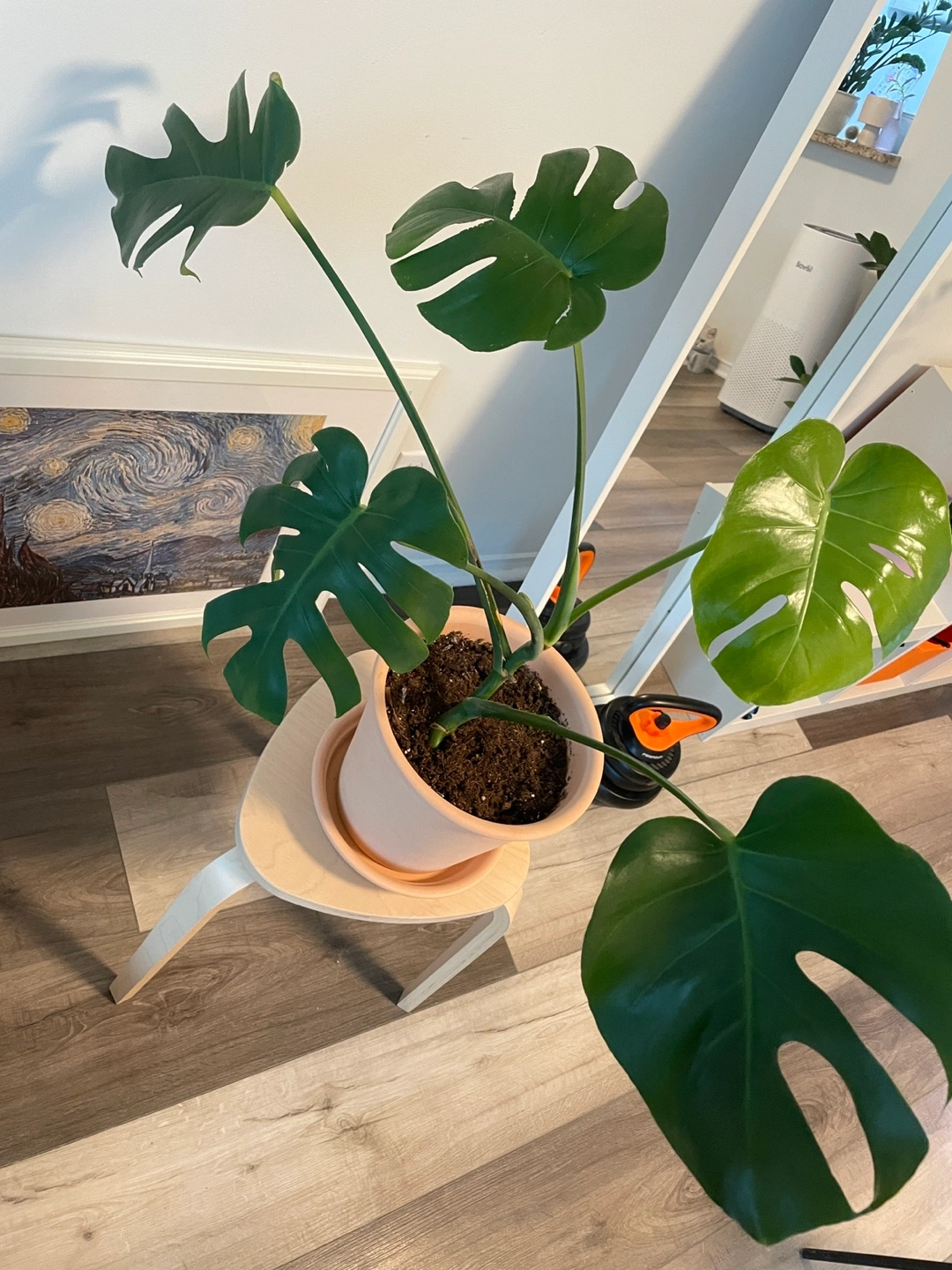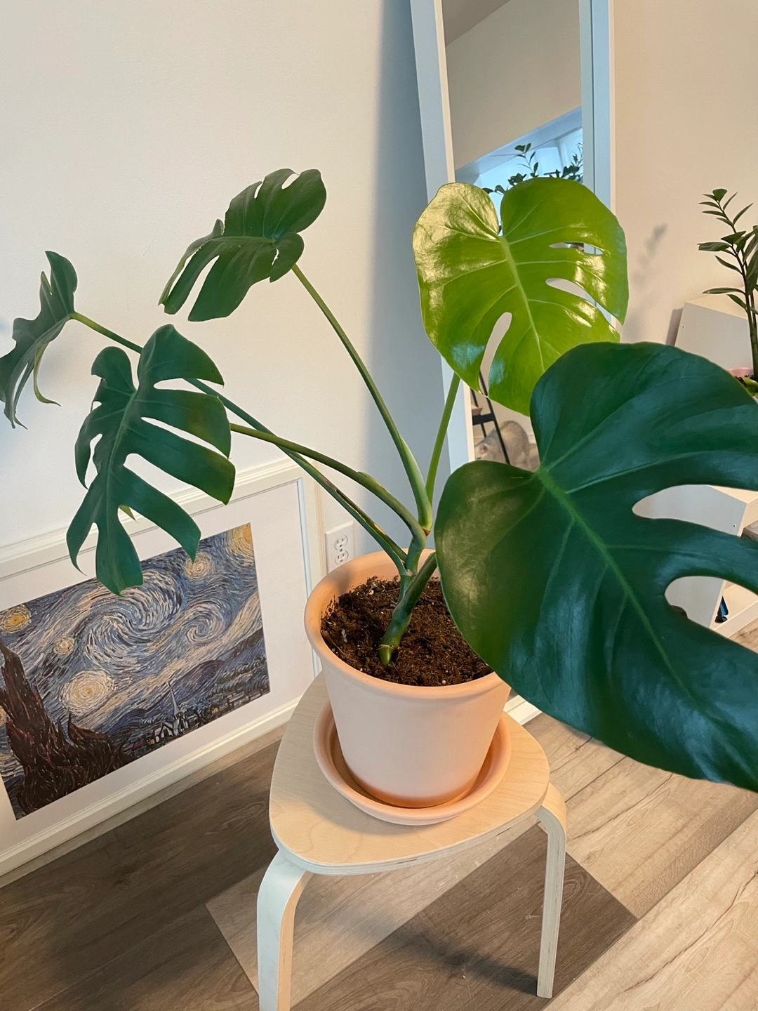 Healthy Monstera deliciosa plant. Potted in a light peach terracotta pot. Several large leaves. Great addition to any home.