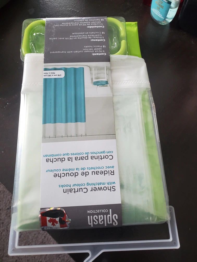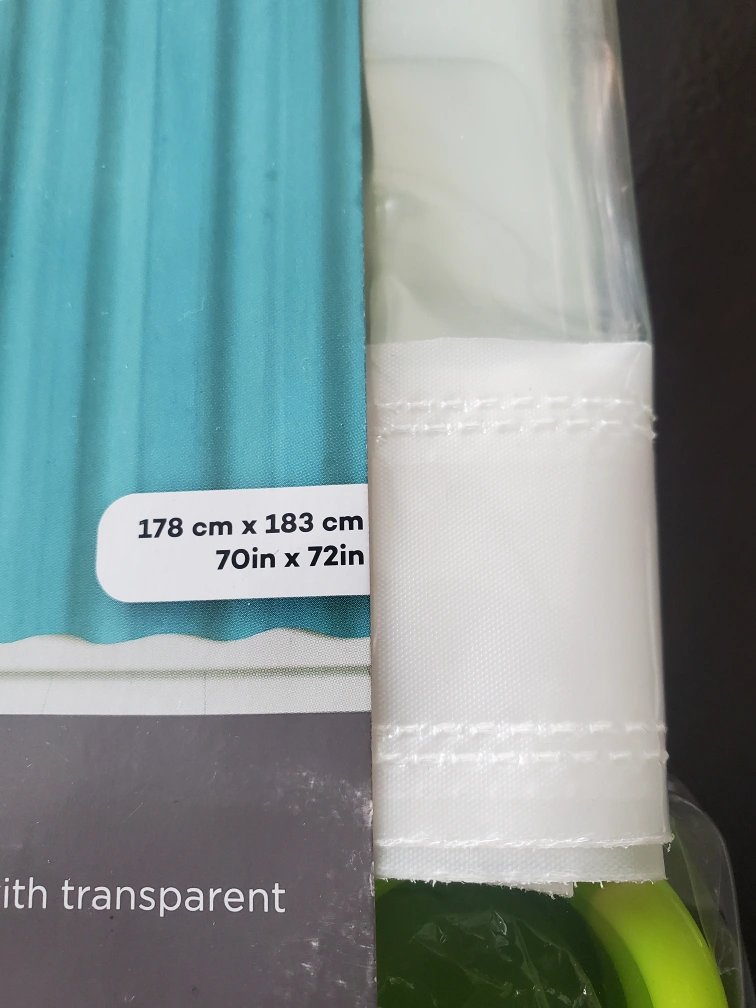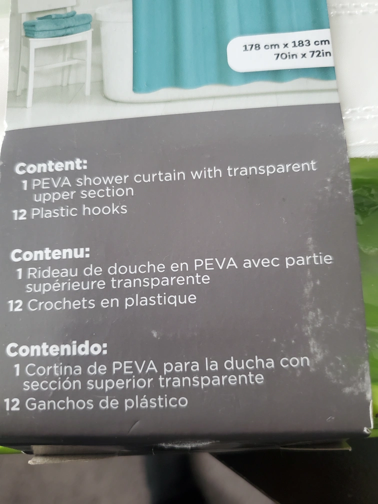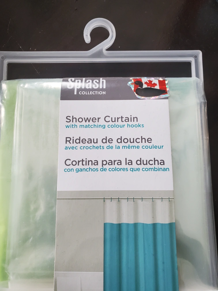 Brand new shower curtain. Teal and lime green. Includes 12 matching plastic hooks. 70in x 72in.