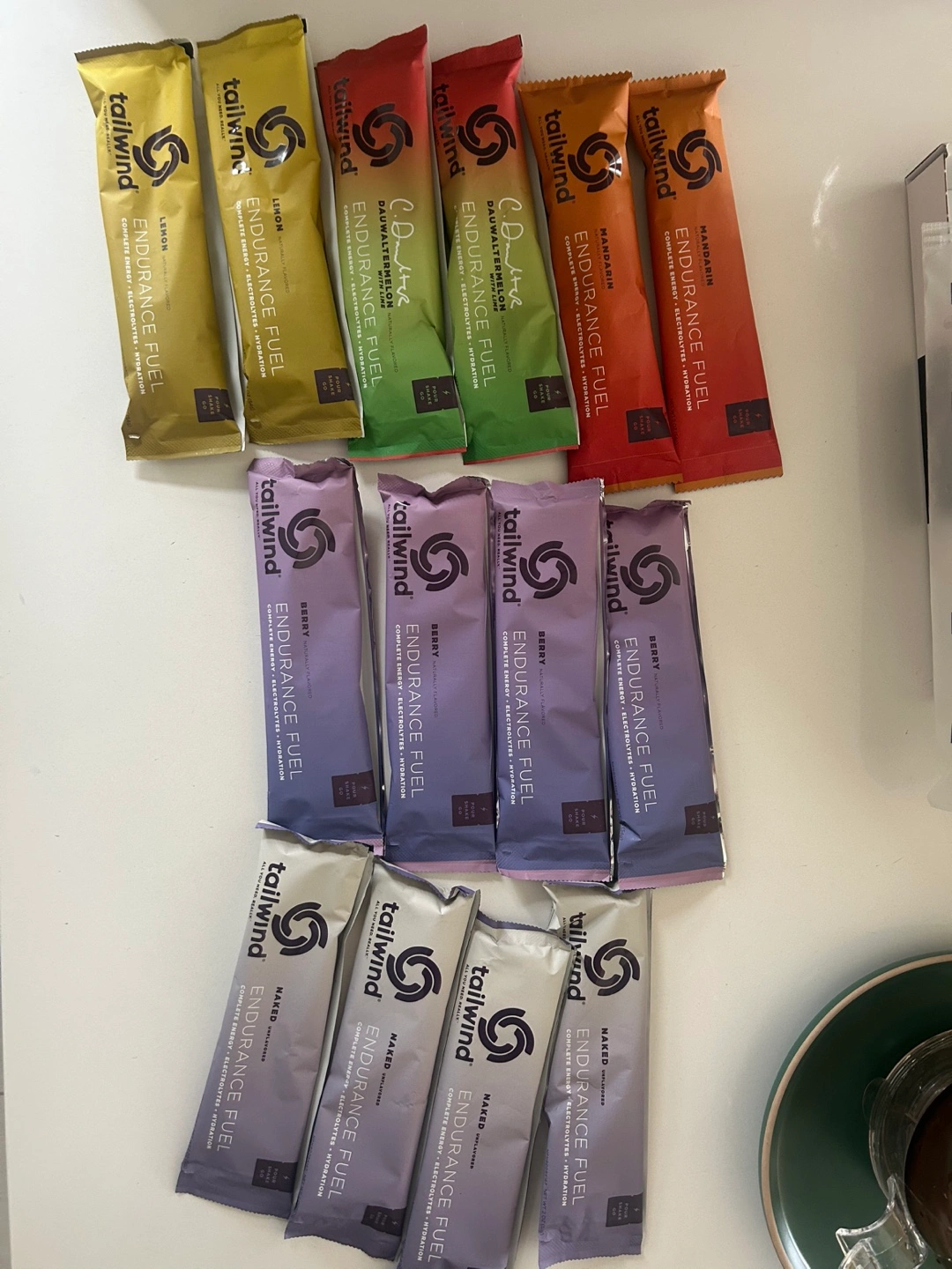Assortment of 14 Tailwind Endurance Fuel packets. Flavors include Mandarin, Watermelon, Lemon, and Berry. Also includes Naked unflavored packets.