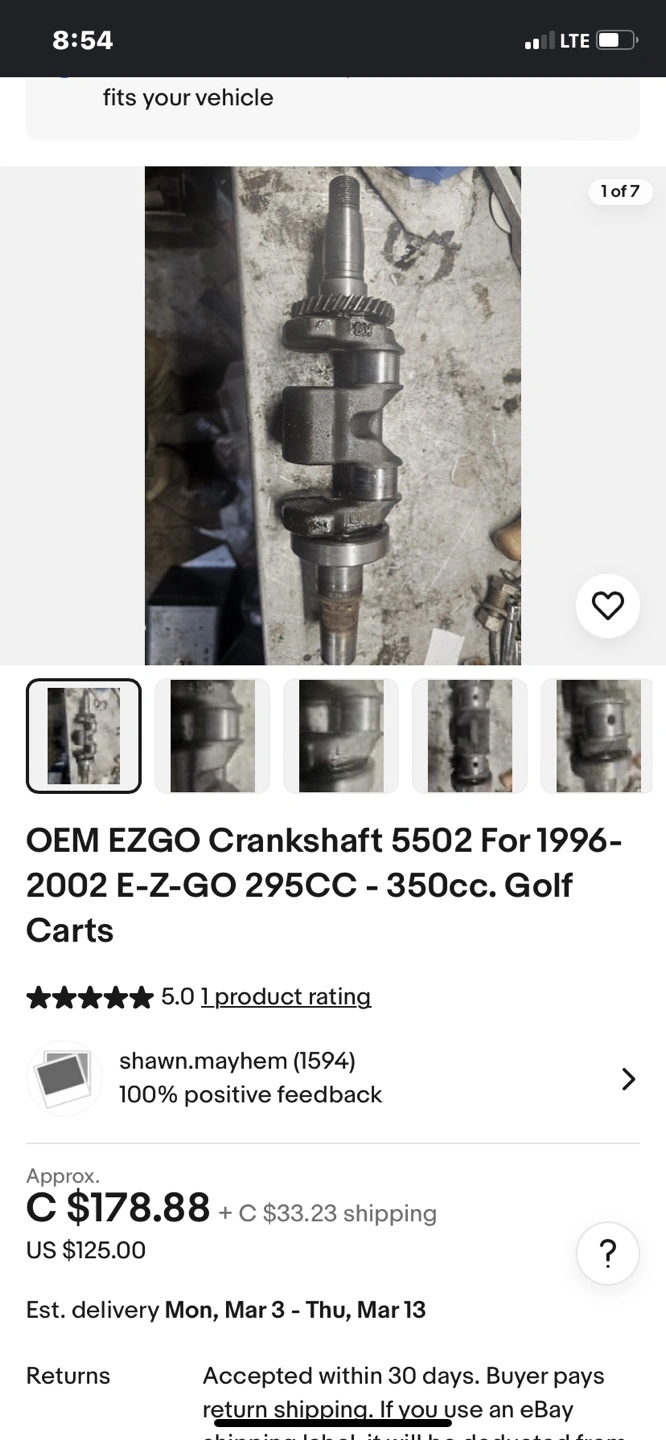 OEM EZGO Crankshaft for 1996-2002 EZGO Golf Carts. Fits 295cc and 350cc engines. Pick up on Kennedy road between 19th Avenue and Stouffville Road