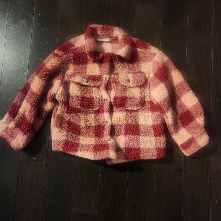 Cute cropped fuzzy jacket. Red and pink buffalo check pattern. Button front. Long sleeves. Soft and warm.