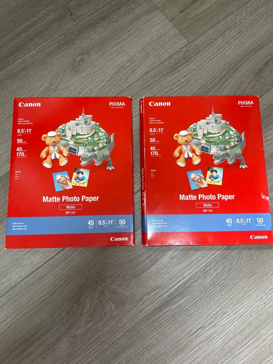 Two packs of Canon PIXMA Matte Photo Paper. 8.5x11 inch, one with 50 sheets and another on has been opened with 26 sheets.