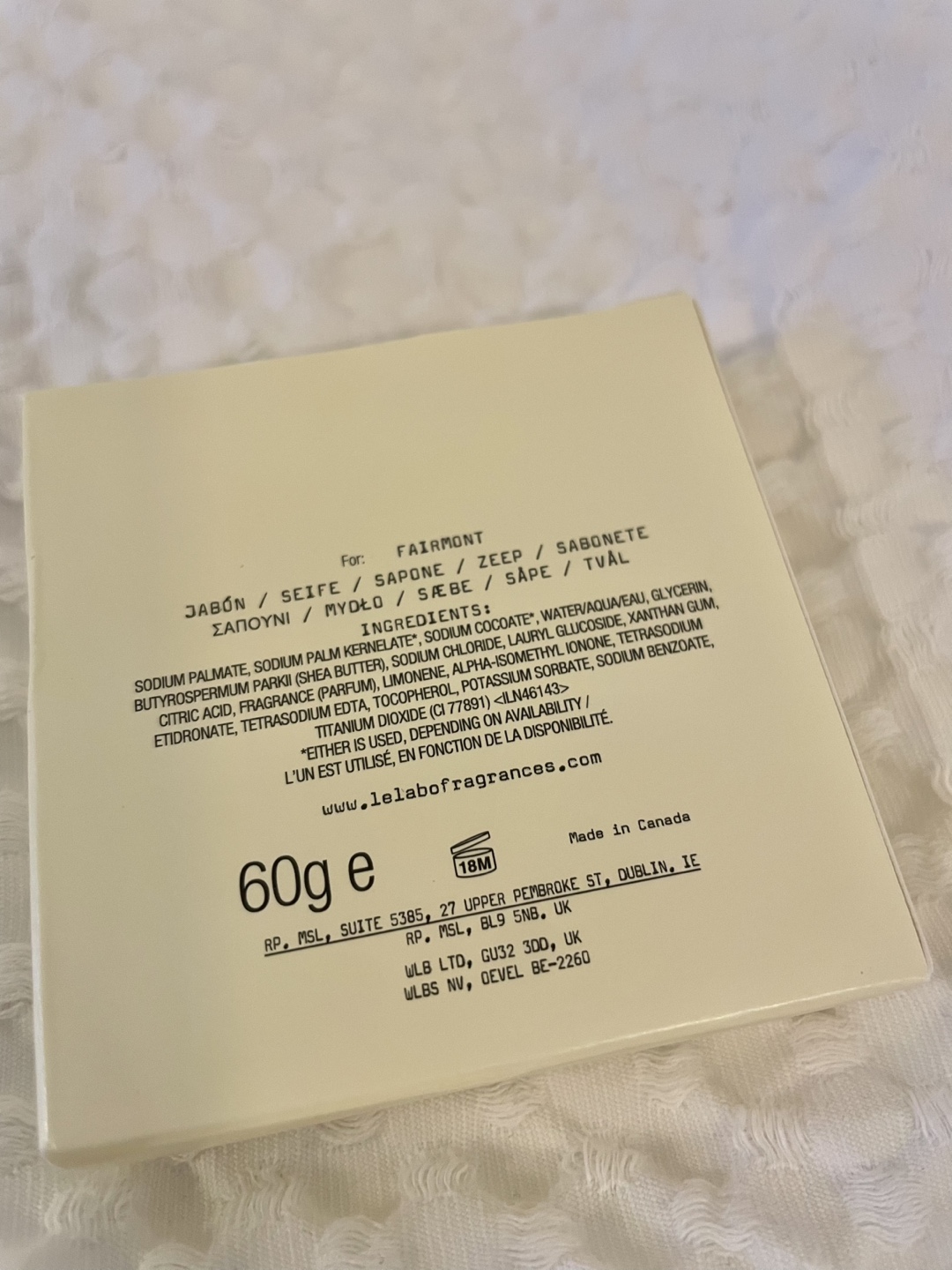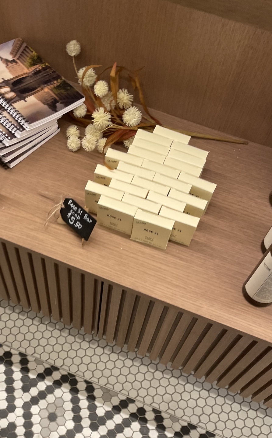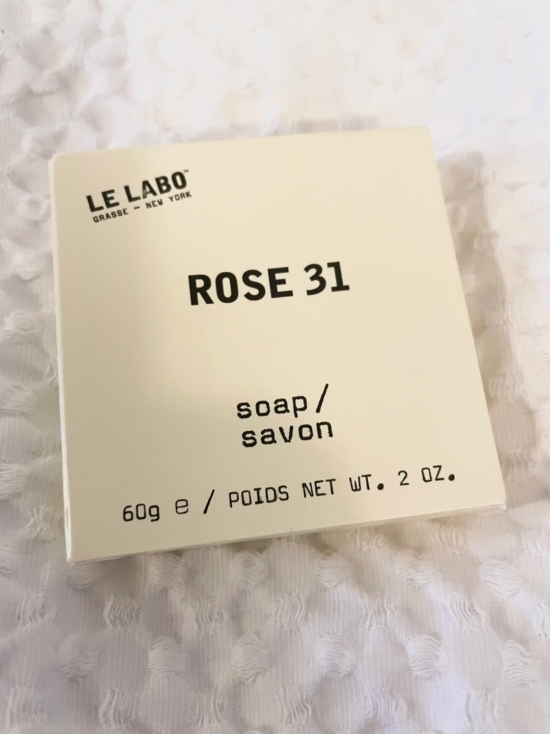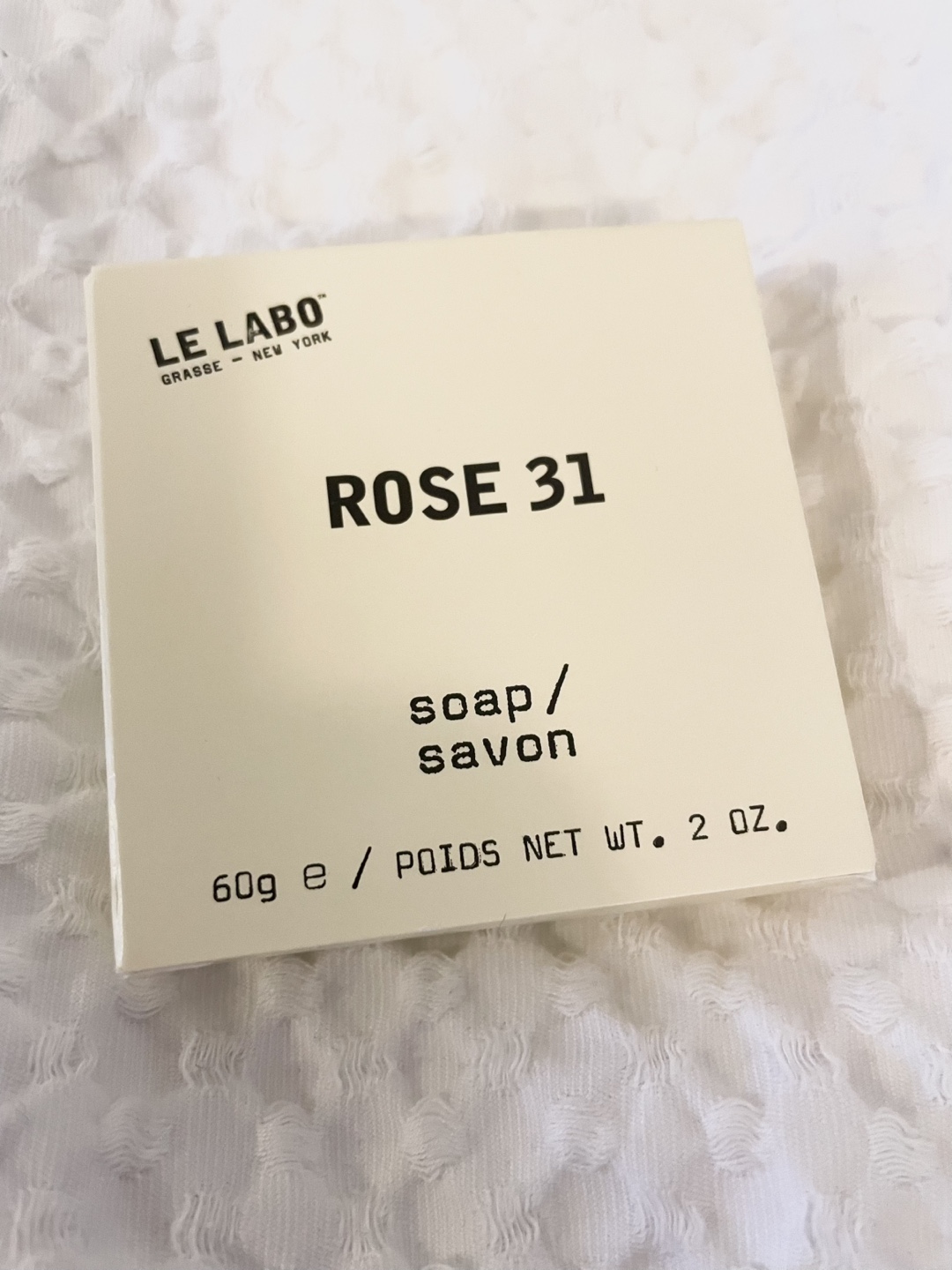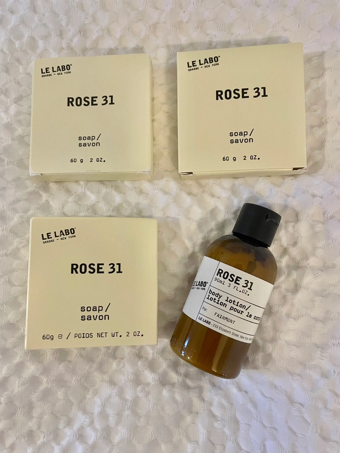 Bought at Fairmont Château Laurier. Three Rose 31 soap bars(60g each). Buy three get a free 90ml Rose 31 body lotion. Single bar soap for $5. Made in Canada.