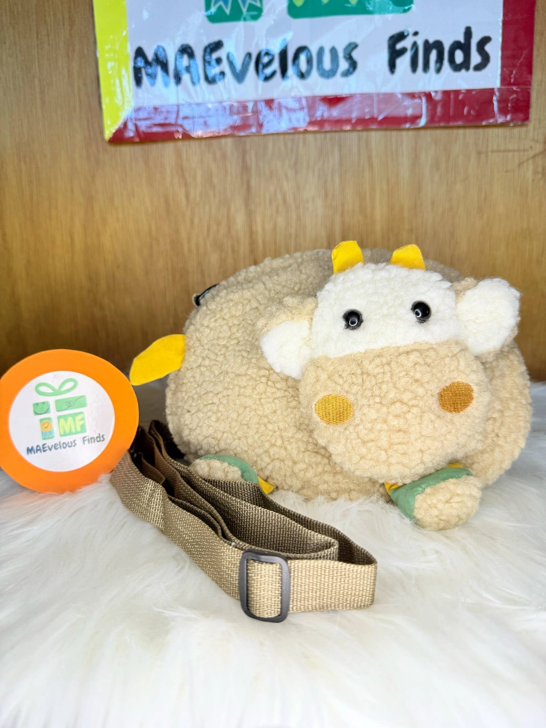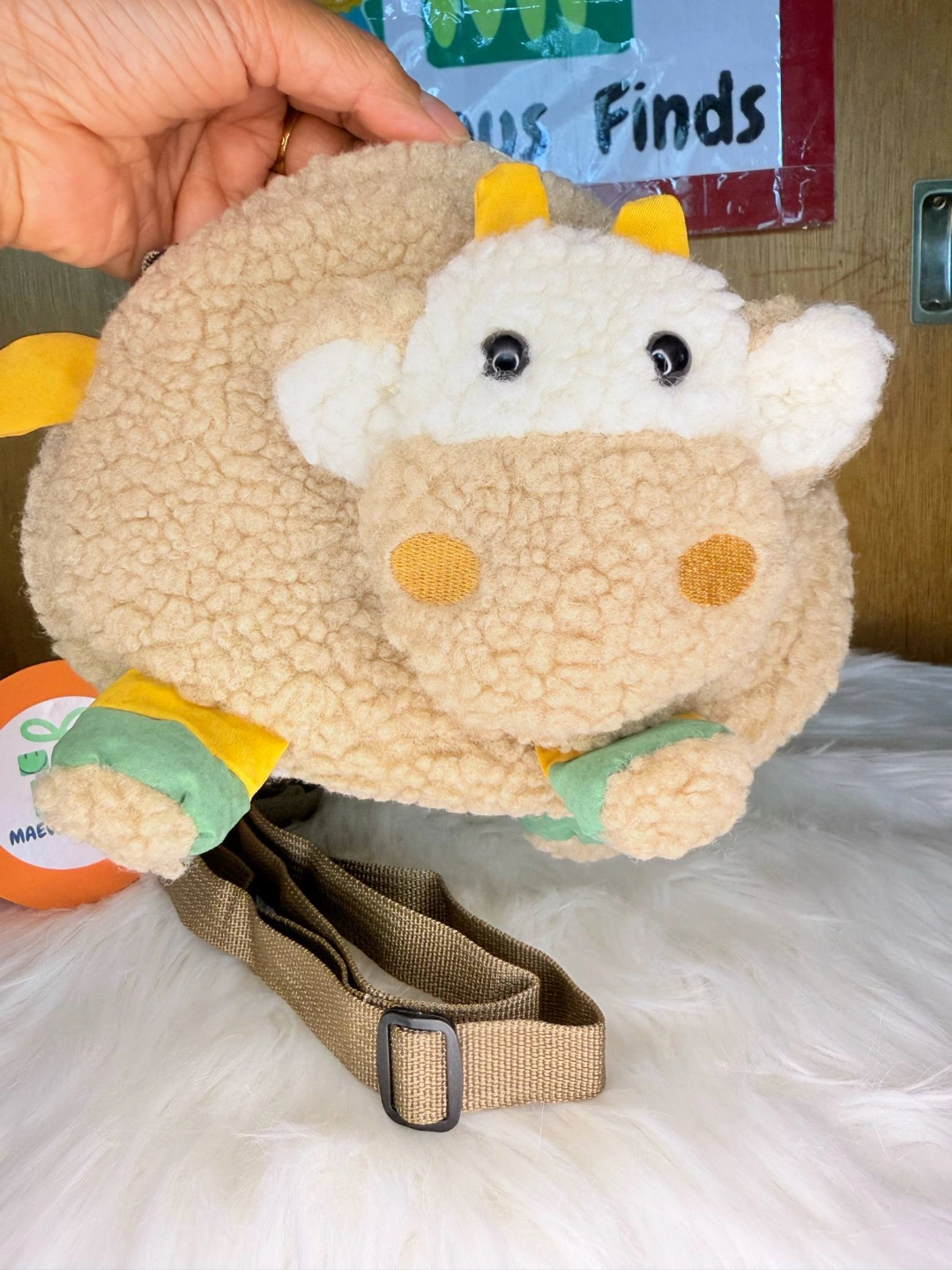 Cute and cuddly cow-shaped bag. Soft plush material. Adjustable shoulder strap. Perfect for carrying small essentials. Great gift for animal lovers.