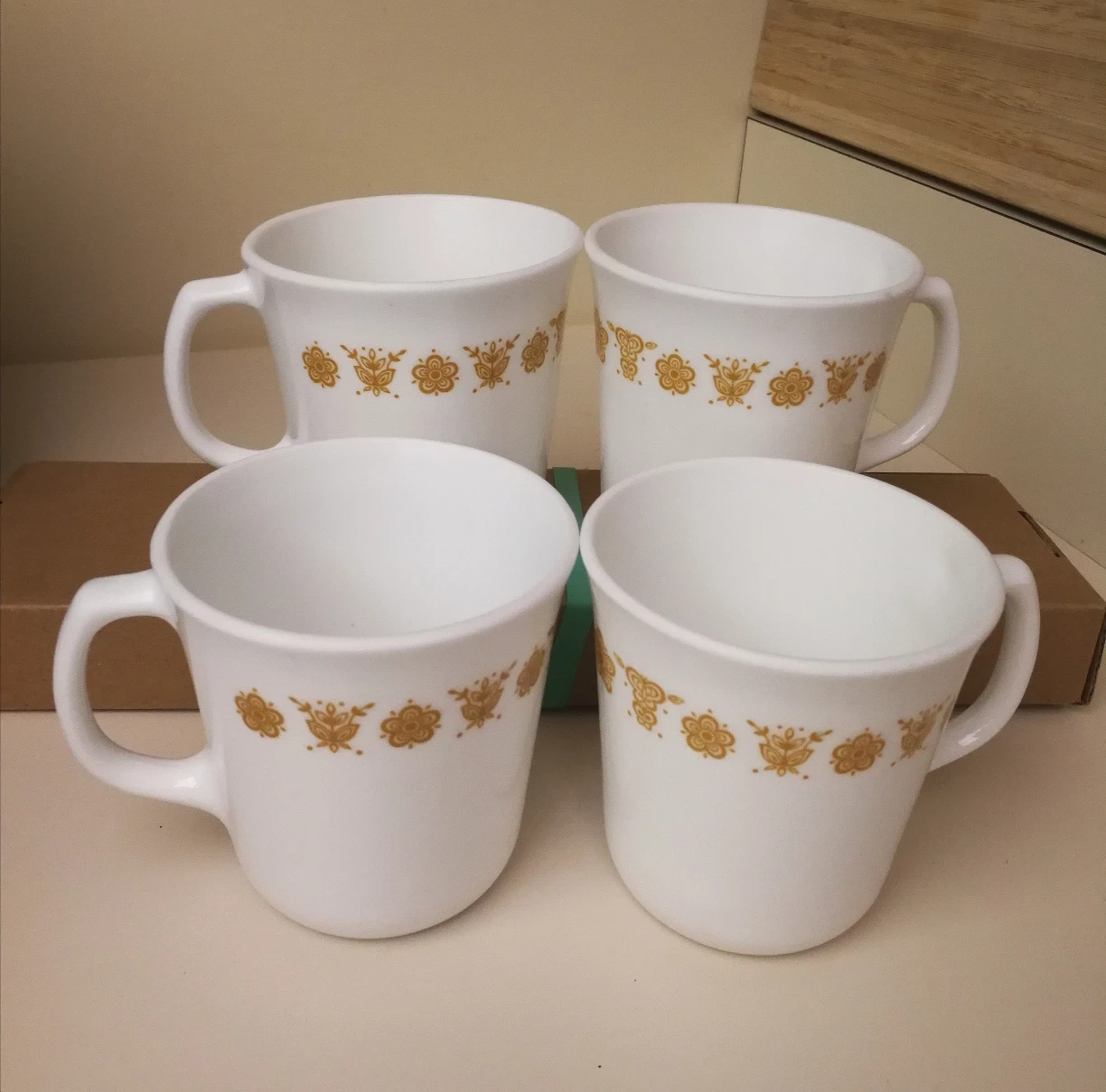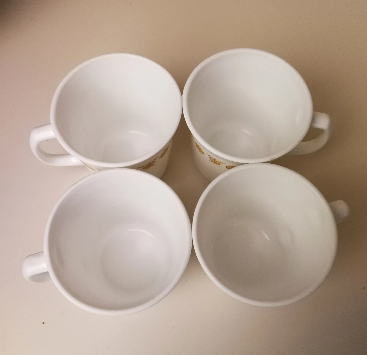 1000+Set of 4 vintage Corning Ware mugs. White with a gold floral pattern. Microwave and oven safe. pick up in downtown close to St Patrick station, Dundas-University area