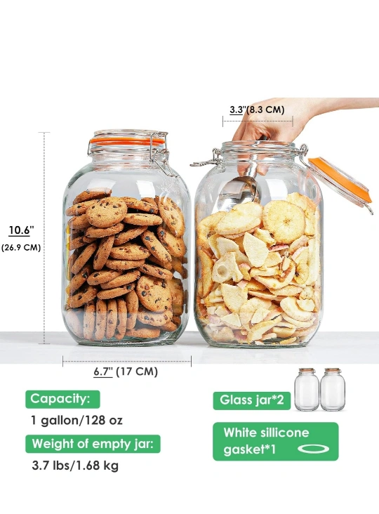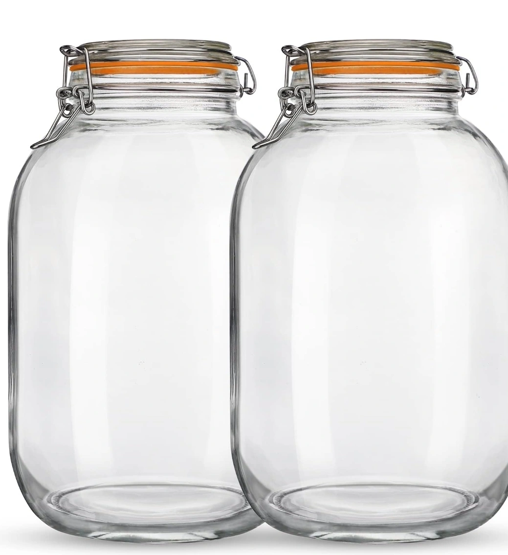 Two large glass jars, perfect for storing dry goods or homemade preserves. Airtight lids ensure freshness. Each jar holds one gallon. Orange silicone seals included.