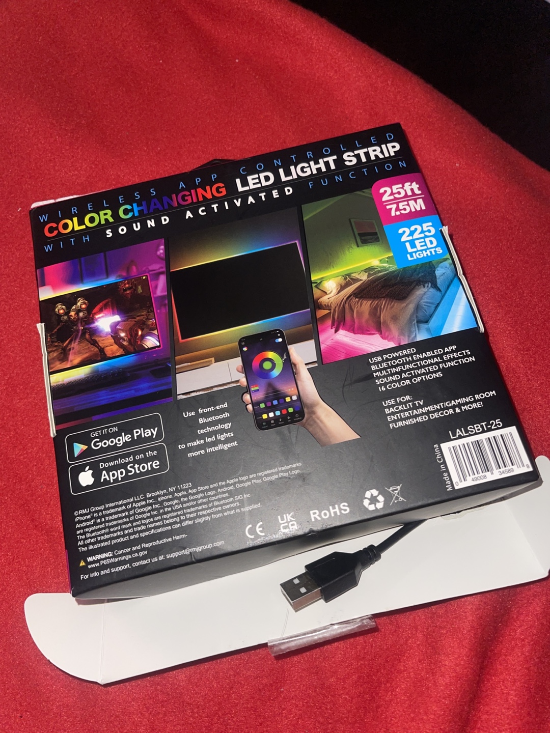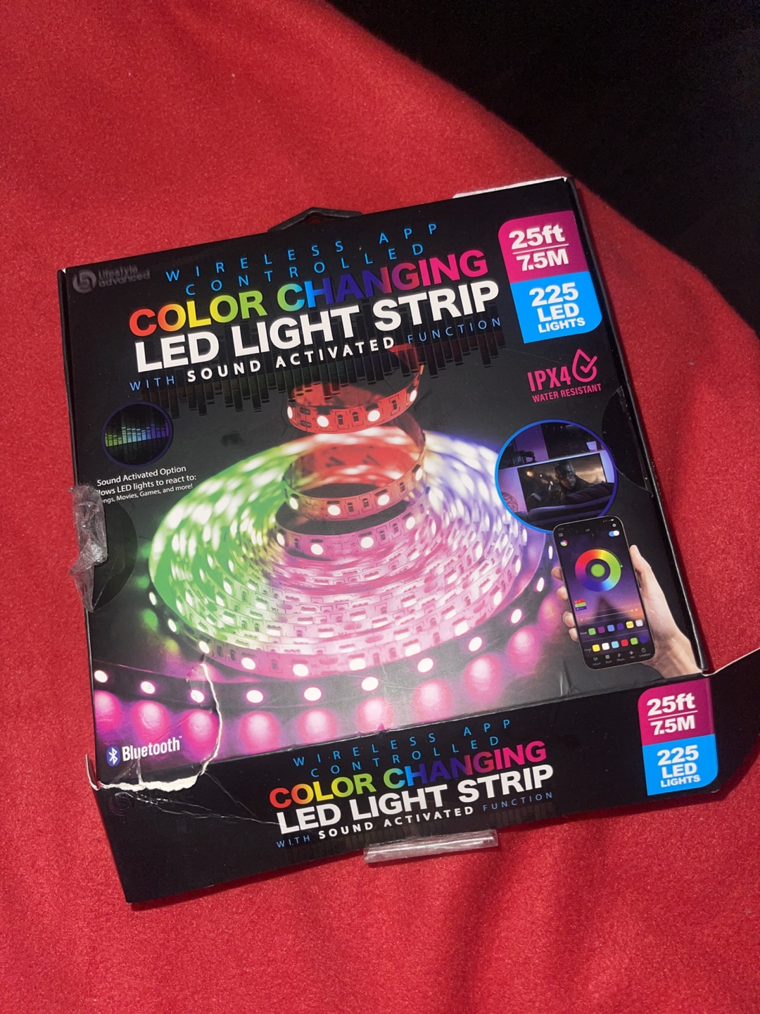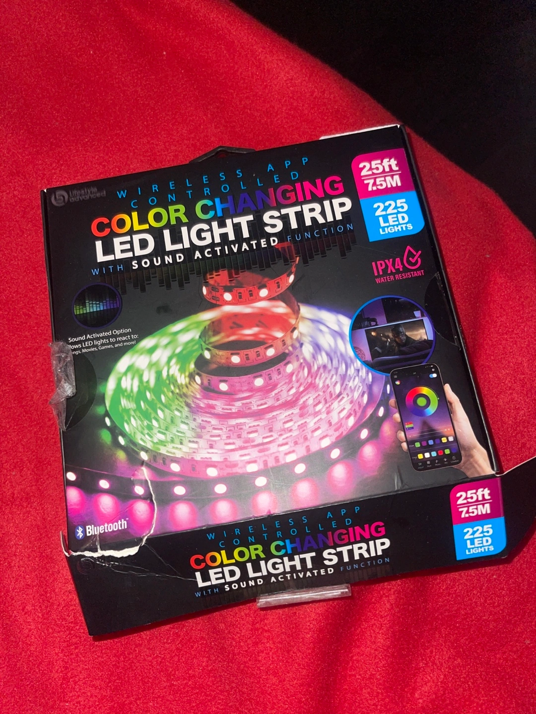 25ft LED light strip. Colour changing. Wireless APP and Bluetooth controlled. Sound activated function. IPX4 water resistant. USB powered. Includes 225 LED lights.