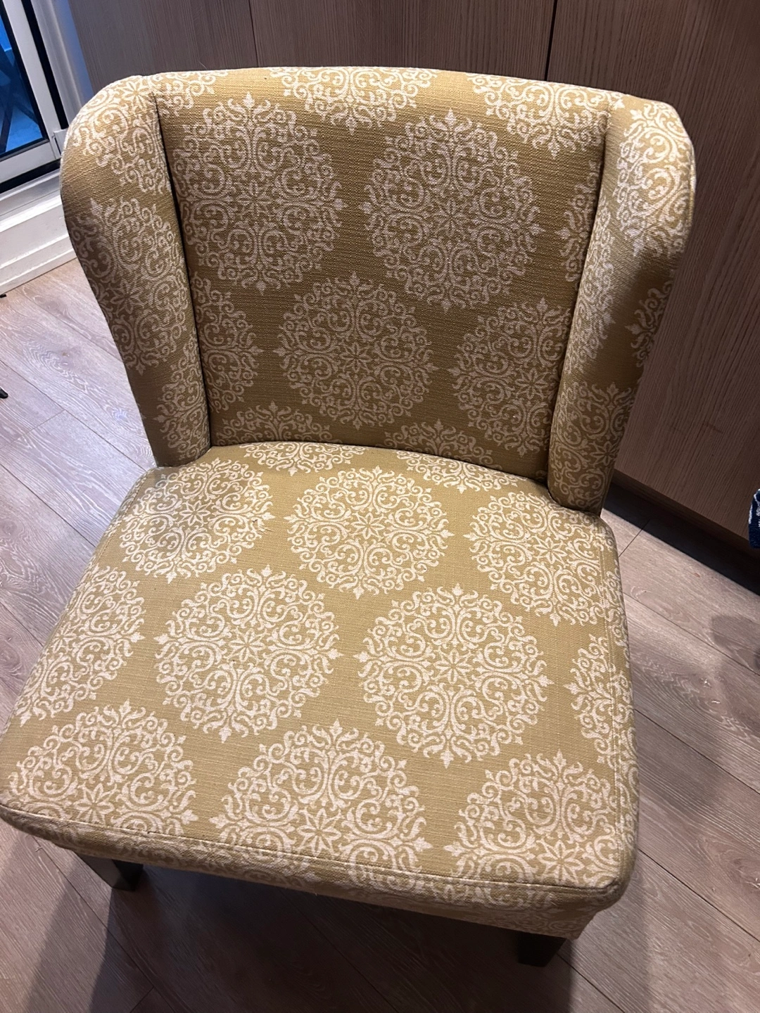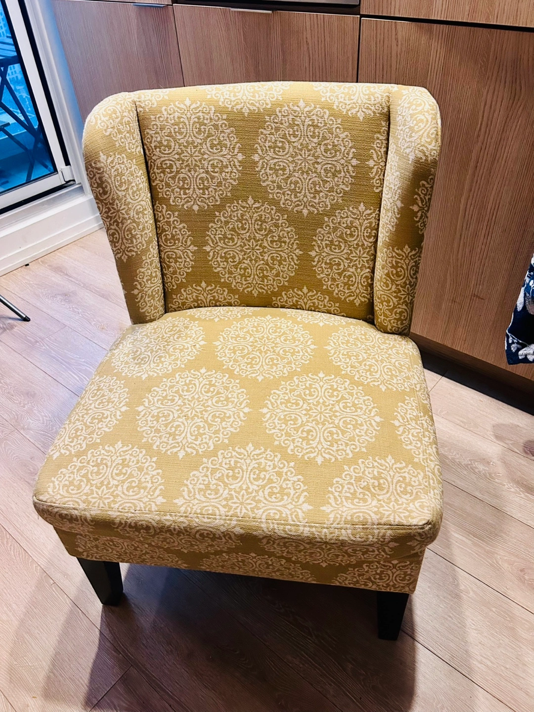 1000+Stylish accent chair. Features a light shuttle green fabric with an off-white damask pattern. Dark brown legs. Perfect for adding a touch of elegance to any room. Can be mix matched with any colour table and sofas Originally bought for 500+$ Bay and temperance