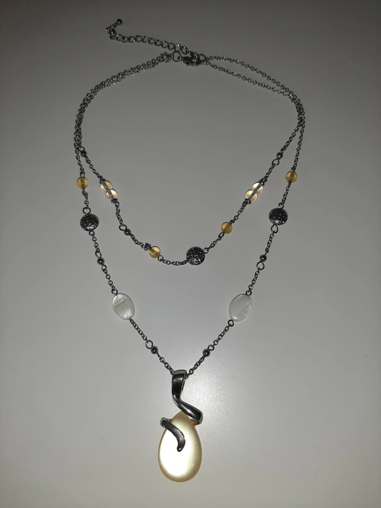 Double strand necklace. Features silver-tone chain, pale yellow and white beads, and a teardrop pendant. Elegant and stylish.
