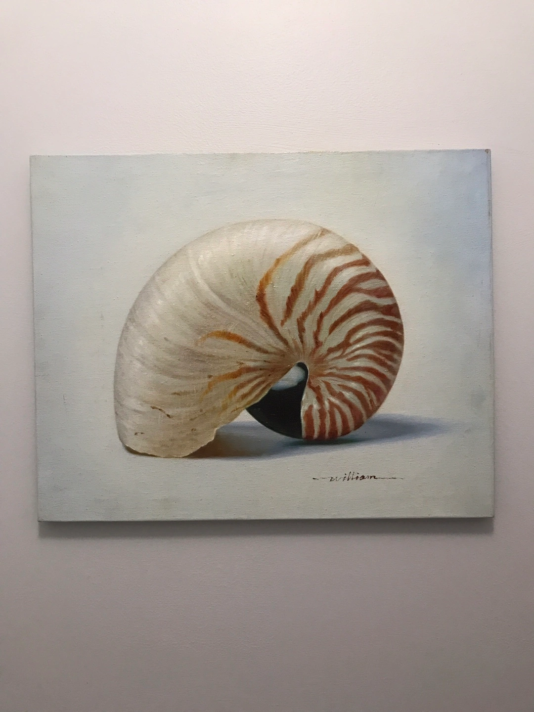 Original oil painting on canvas. Depicts a nautilus shell. Artist signature visible. Beautiful colours and detail.