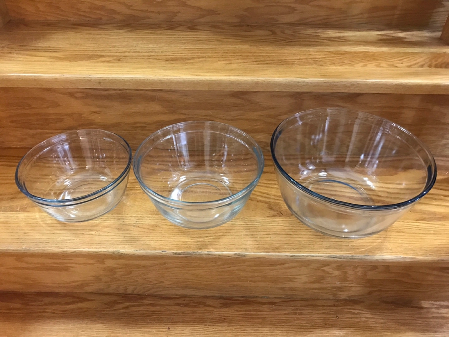 Anchor Ovenware. Three clear glass mixing bowls. Perfect for baking or mixing ingredients.