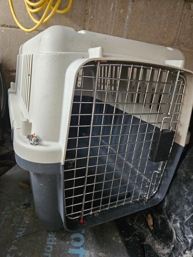 Plastic pet carrier. Good for small to medium-sized pets. Features a metal wire door. Used condition.
