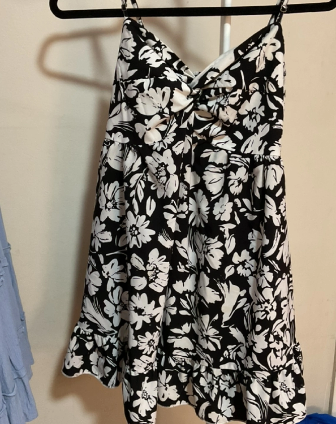 546👗 Cute black and white floral sundress. 📍Pickup in Mimico - M8Y 2R4 🫧Great condition and clean ✅ adjustable Spaghetti straps 🖤 size large