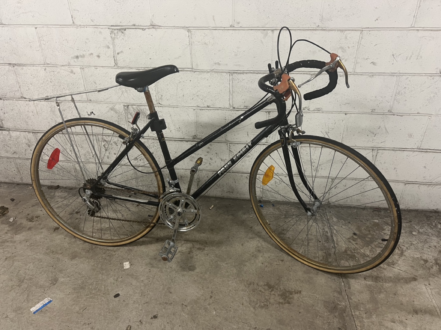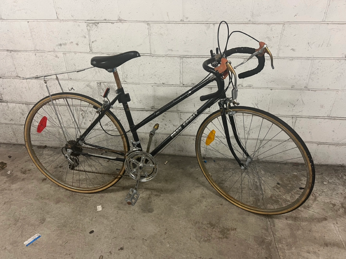 Black road bicycle. Features cream-coloured tires, rear rack, and original components. Shows wear consistent with age and use.