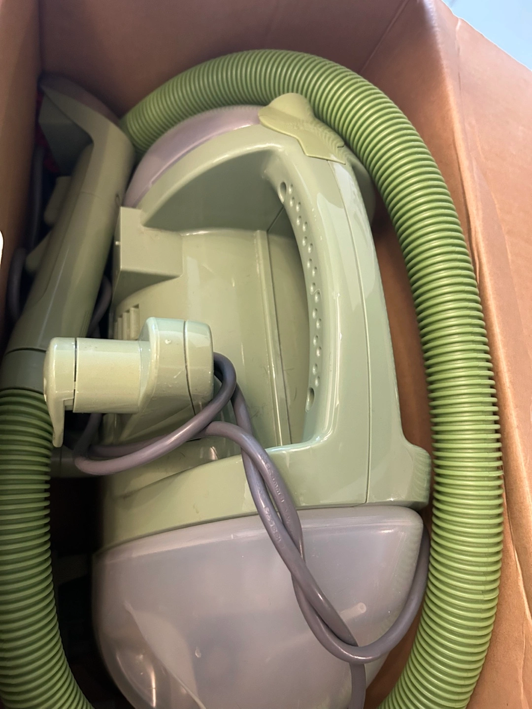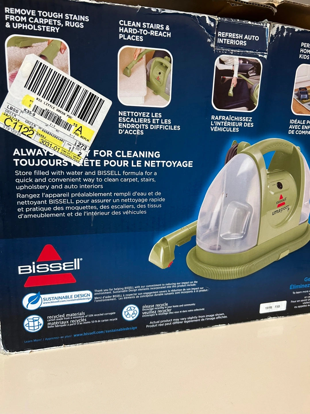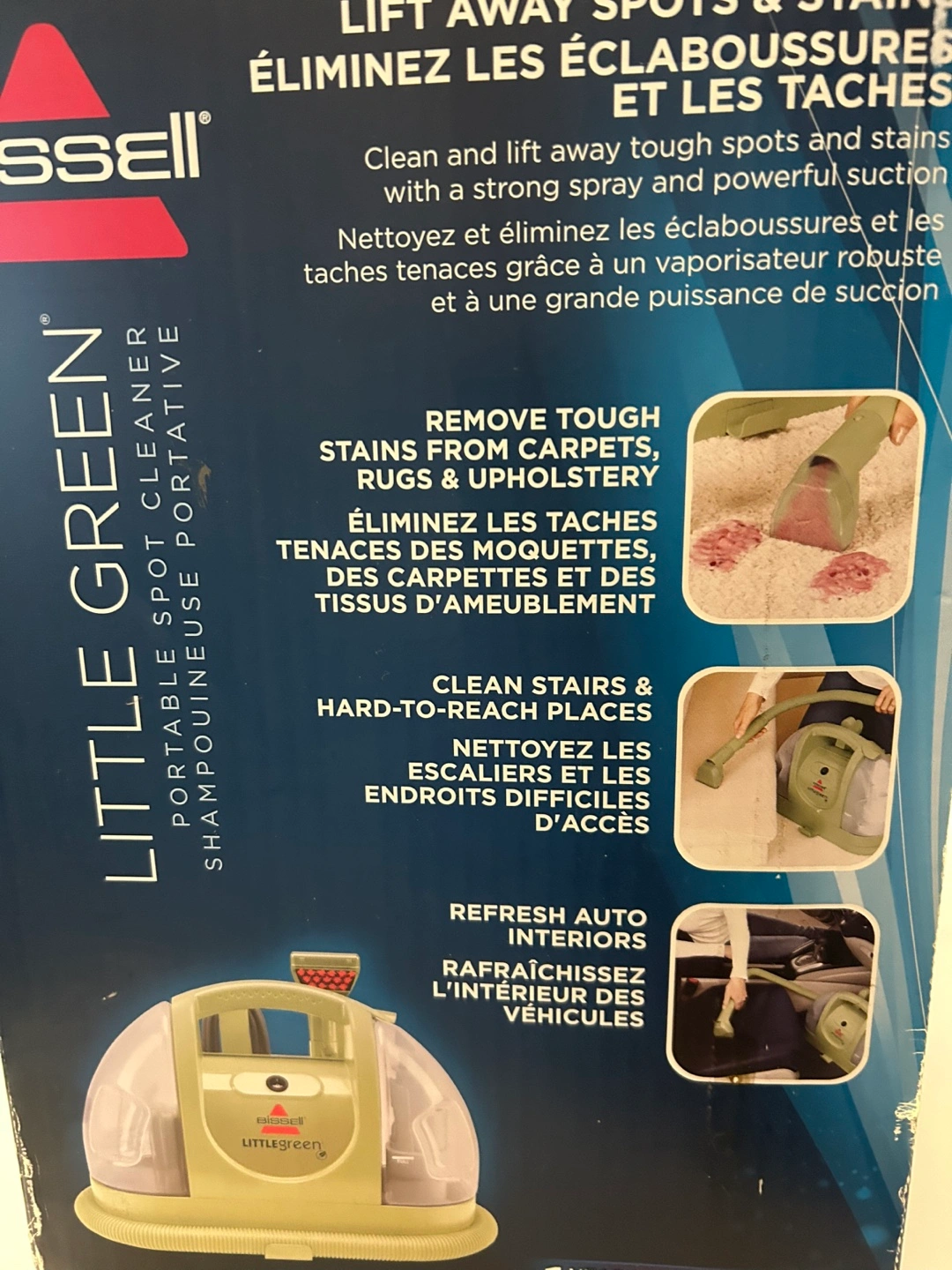 Portable spot cleaner. Green. Cleans carpets, rugs, upholstery, stairs and hard-to-reach places. Refreshes auto interiors. Comes in original box.