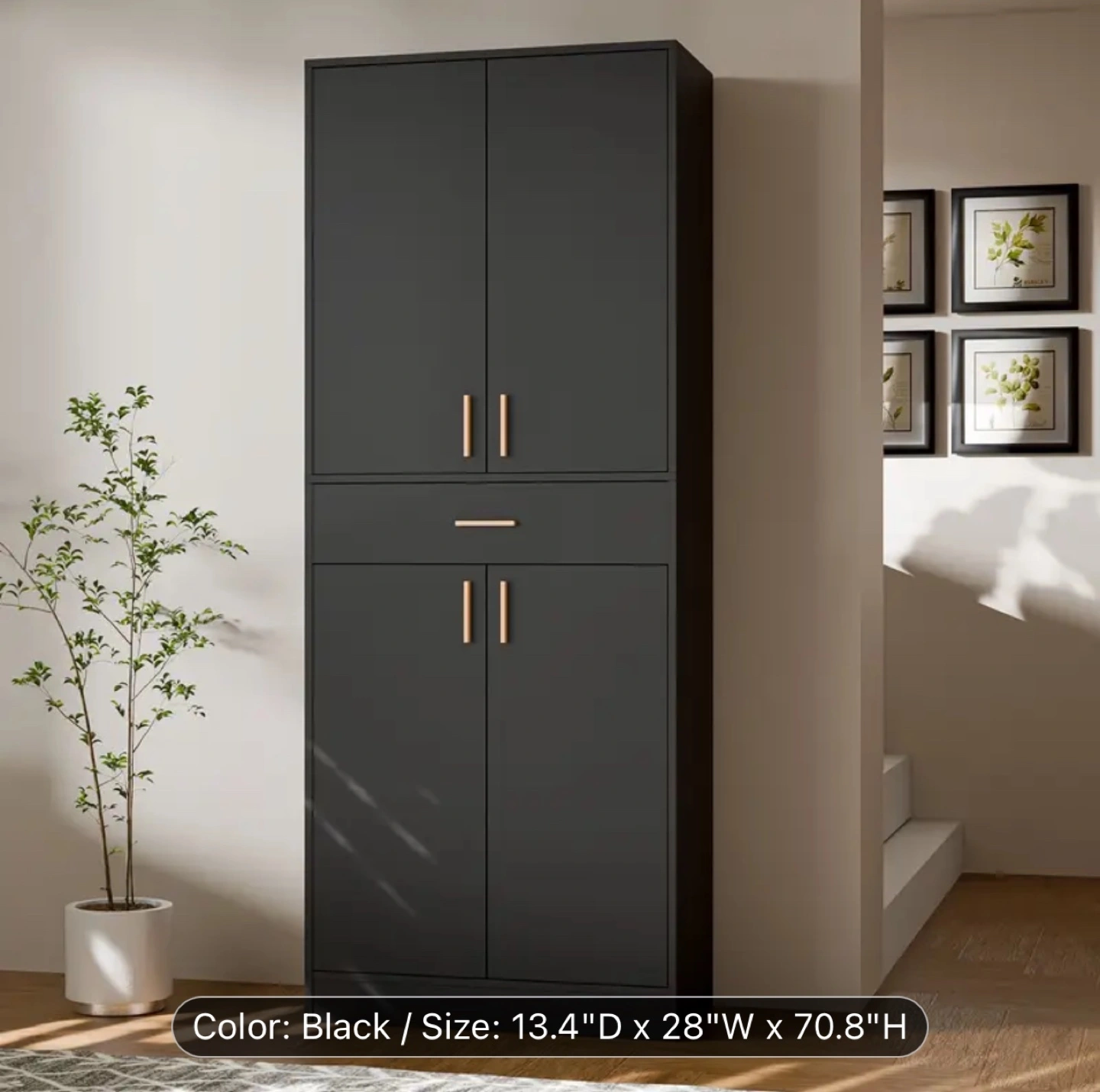 Still in box. Modern storage cabinet. Black finish. Gold handles. Two doors, one drawer. Ample storage space. 70.8 inches tall, 28 inches wide, 13.4 inches deep.