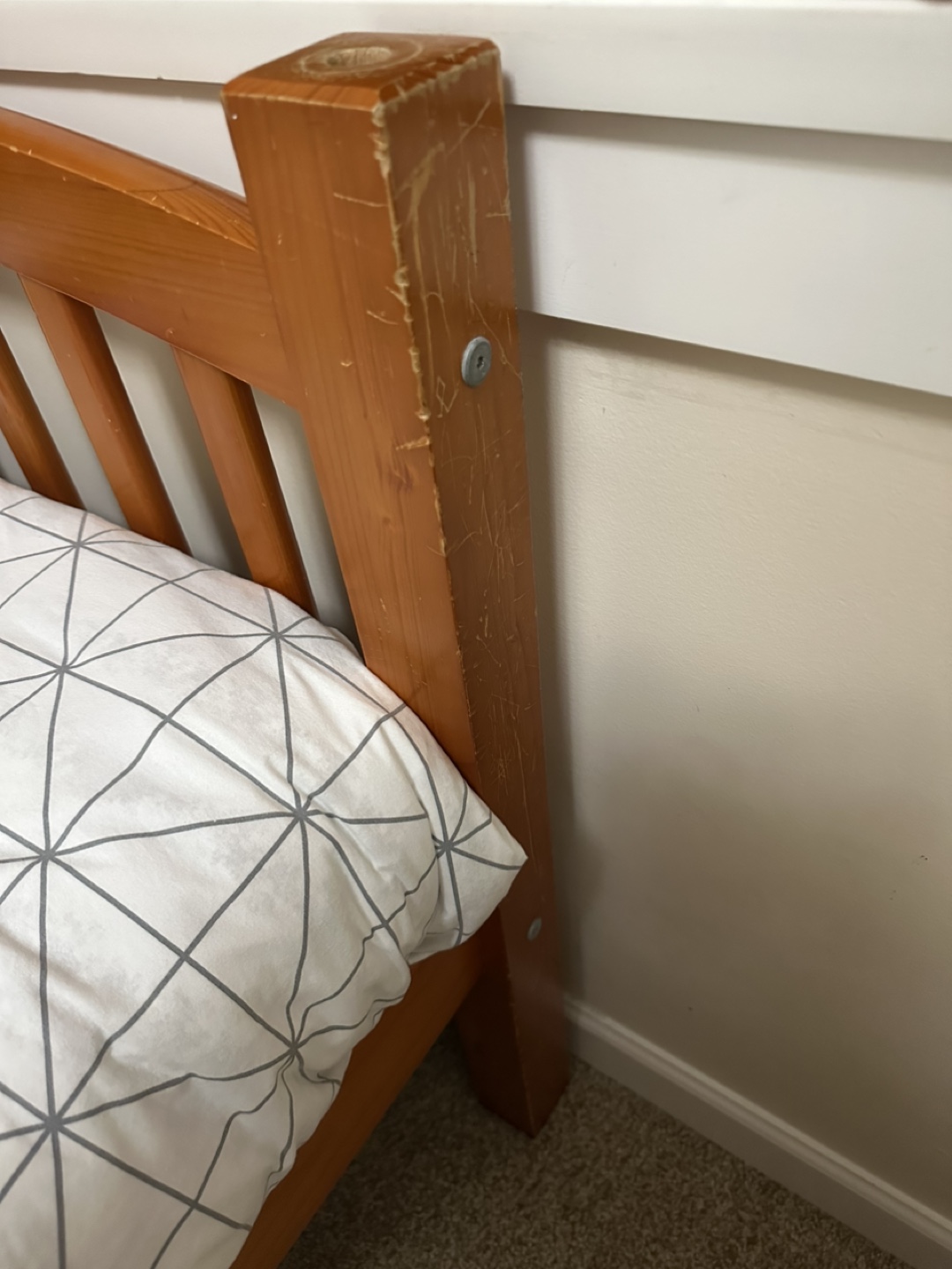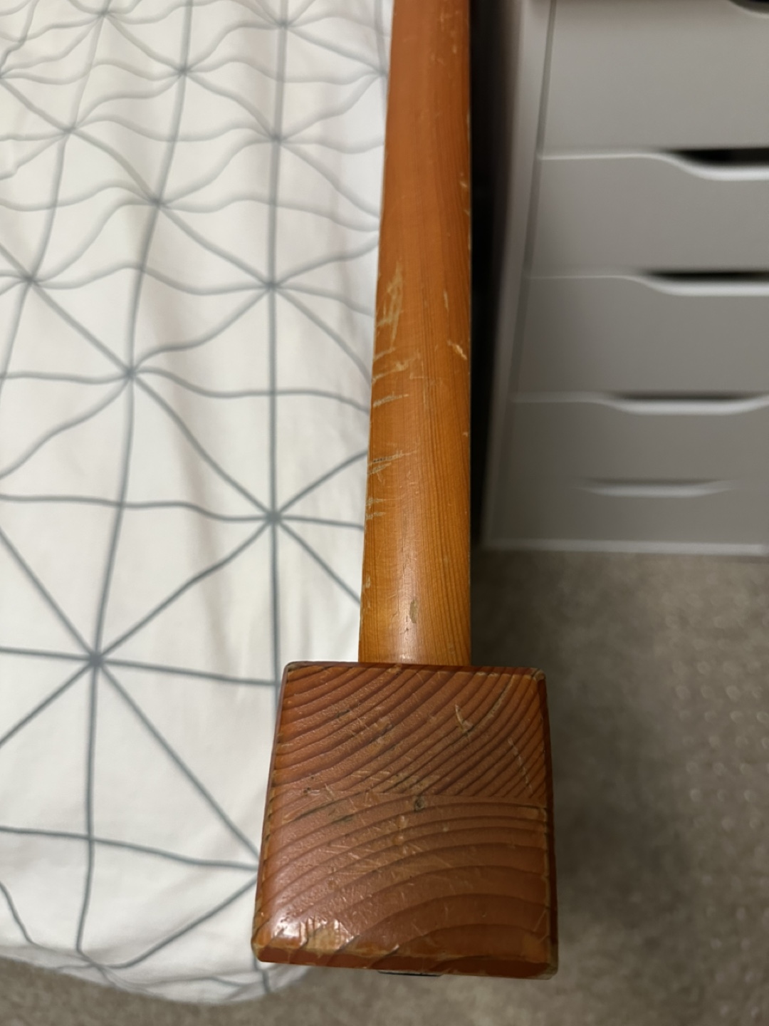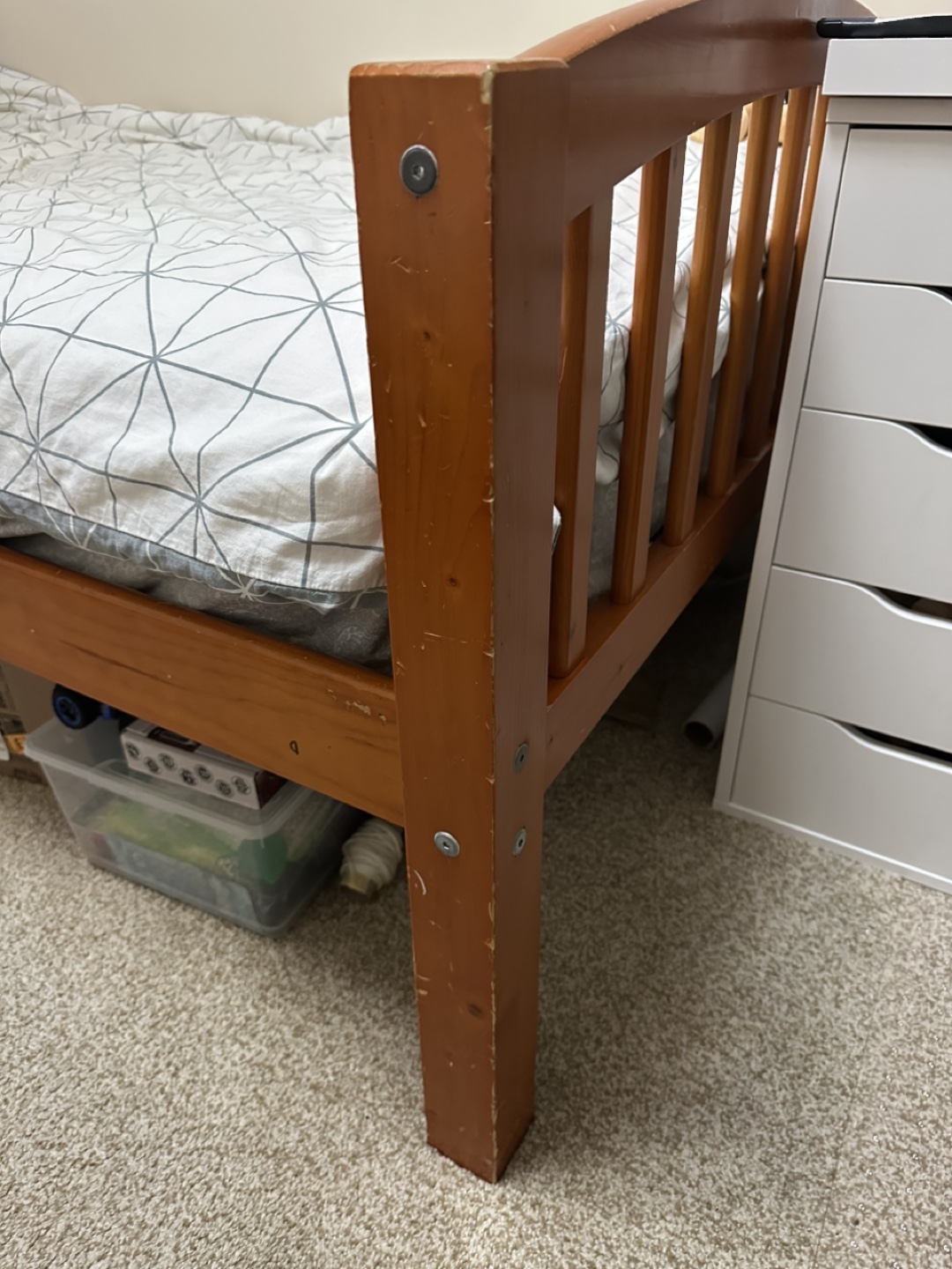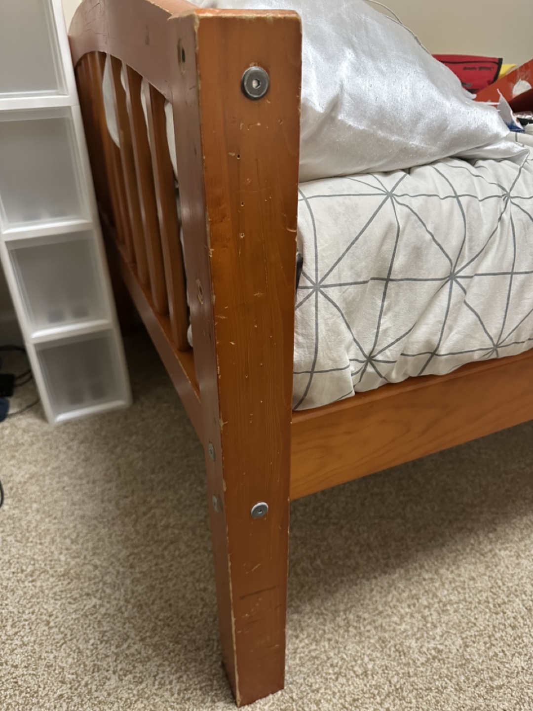 Some wear and tear. Good condition otherwise. Very good quality, stable and comfortable. Simple design. Easy assembly and disassembly.