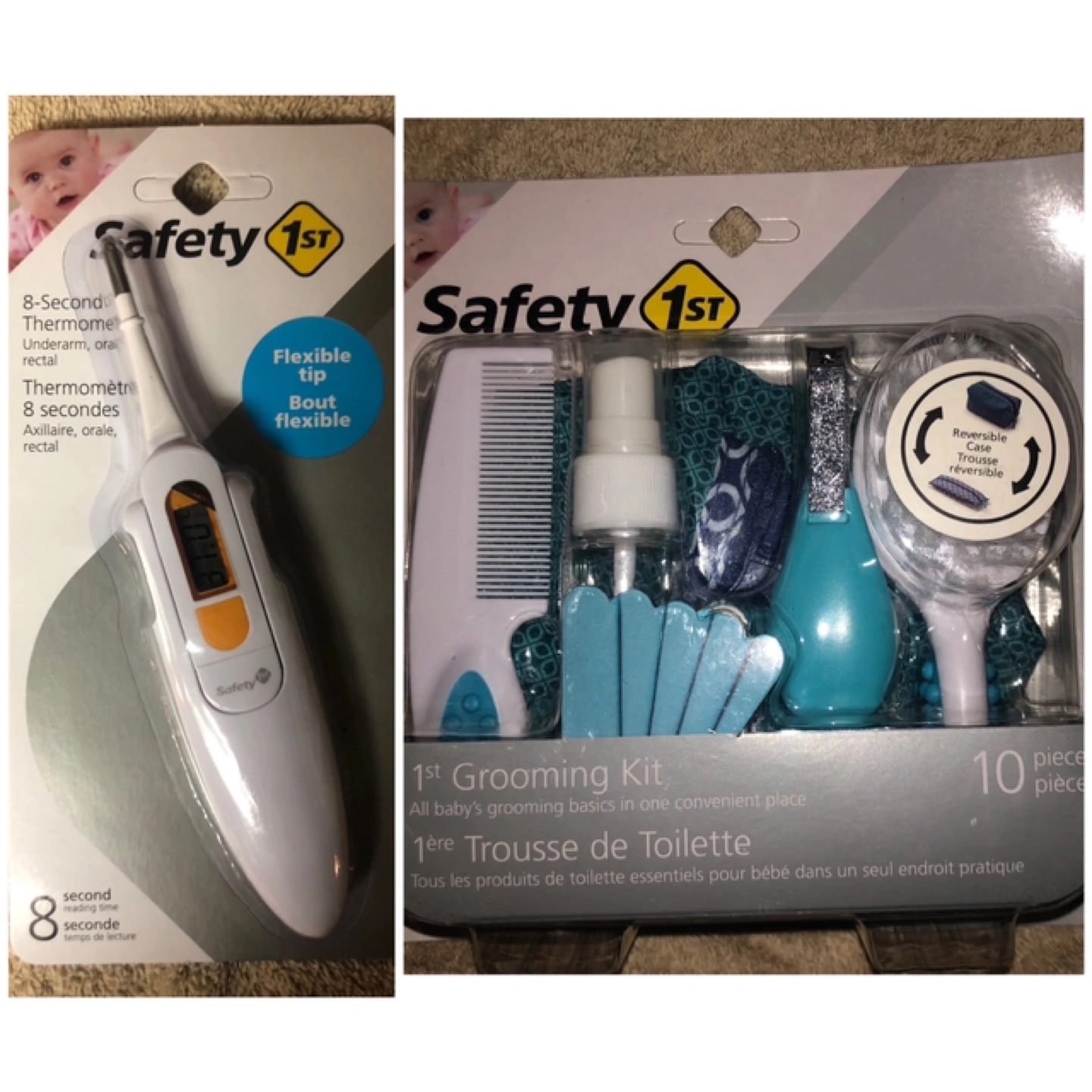 Brand New Safety 1st baby bundle. Includes an 8-second digital thermometer with flexible tip for axillary, oral, and rectal use. Also features a 10-piece grooming kit with comb, brush, nail clippers and more. Perfect for newborns. In Factory Packaging.