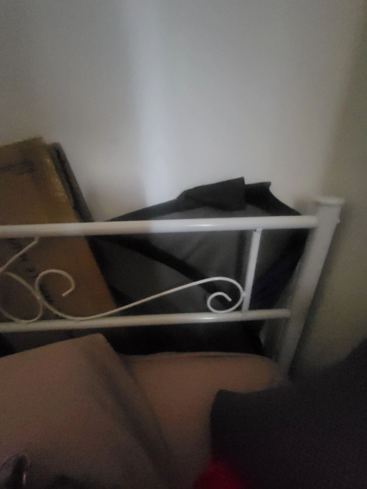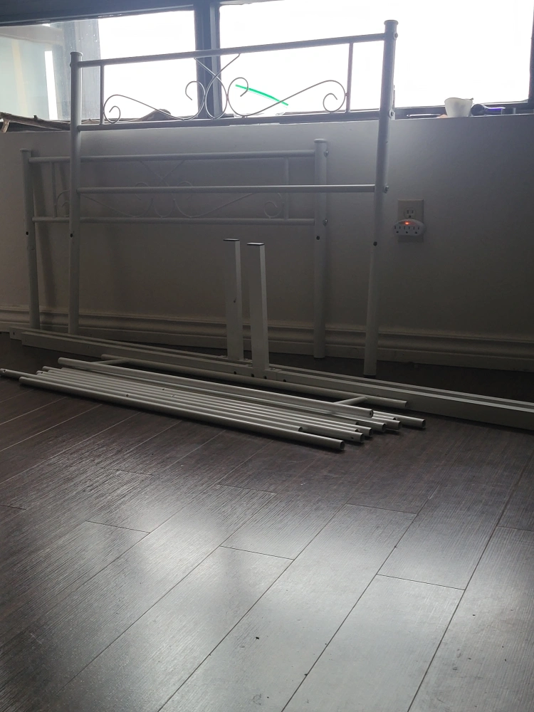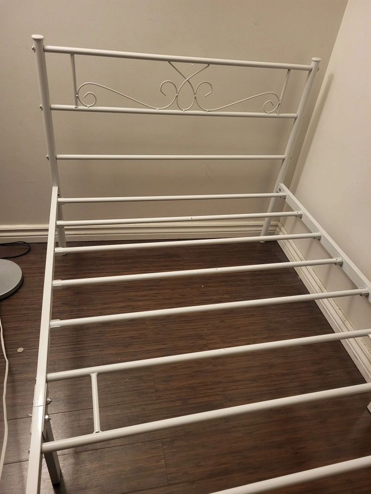 Single bed frame, white metal. Ornate headboard. Some assembly required. Good condition.